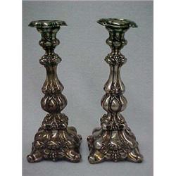 A pair of 19th C. Continental silver candlesticks, with raised grape and leaf decoration, 10 1/4" h, hallmarked, one bobeche replaced