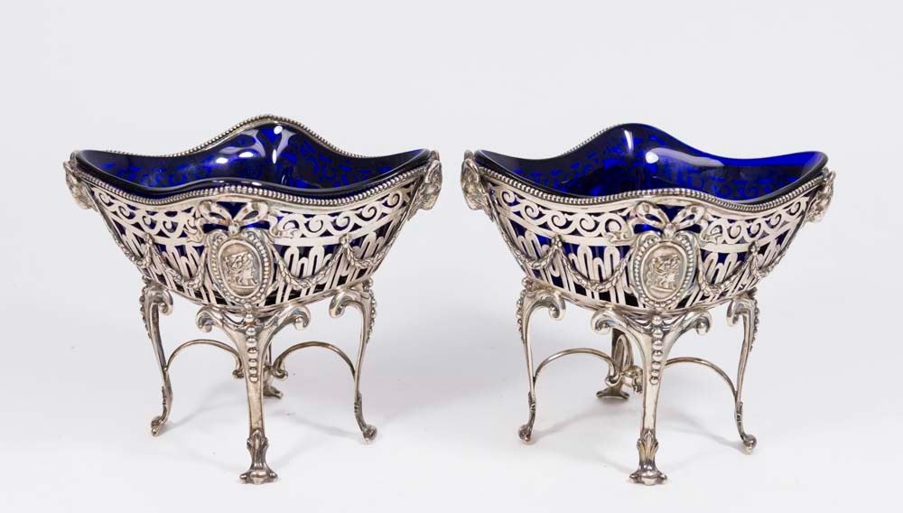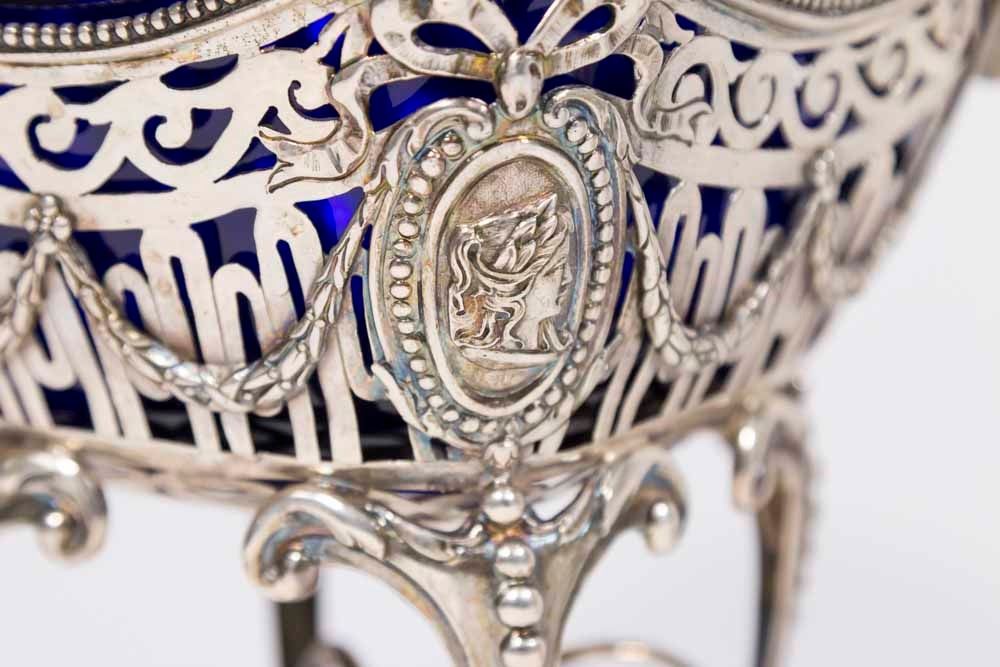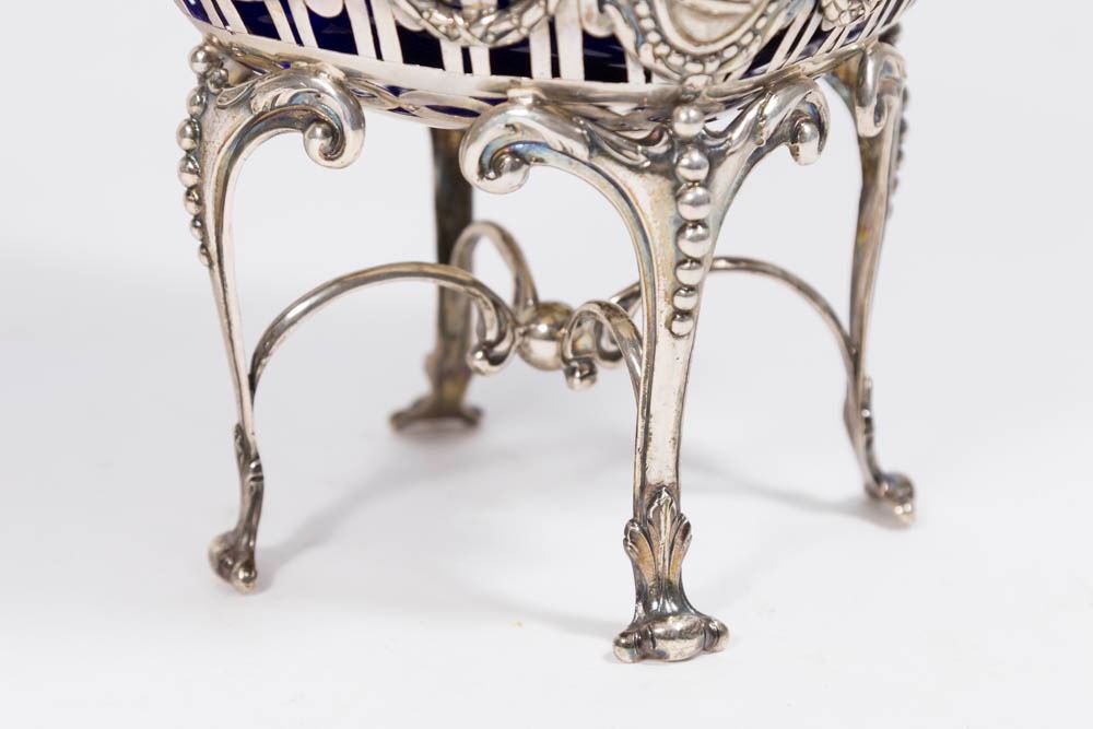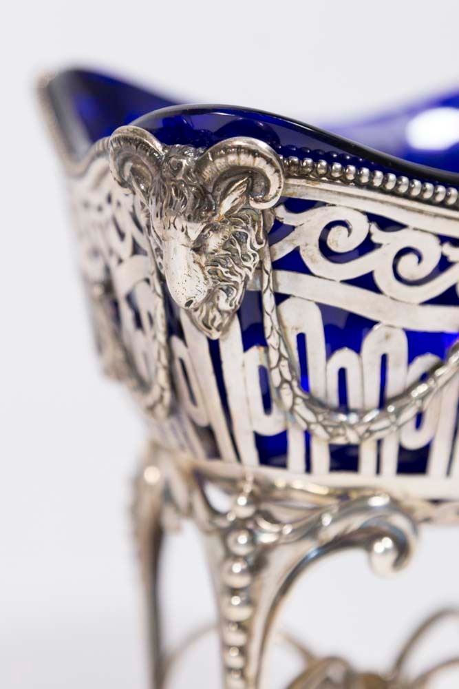 With cobalt glass inserts. Open reticulated design with ram's heads and Caesar's profile. Approx. 6 1/4" x 6 1/4" x 7 1/2". Approx. 26 ozt.