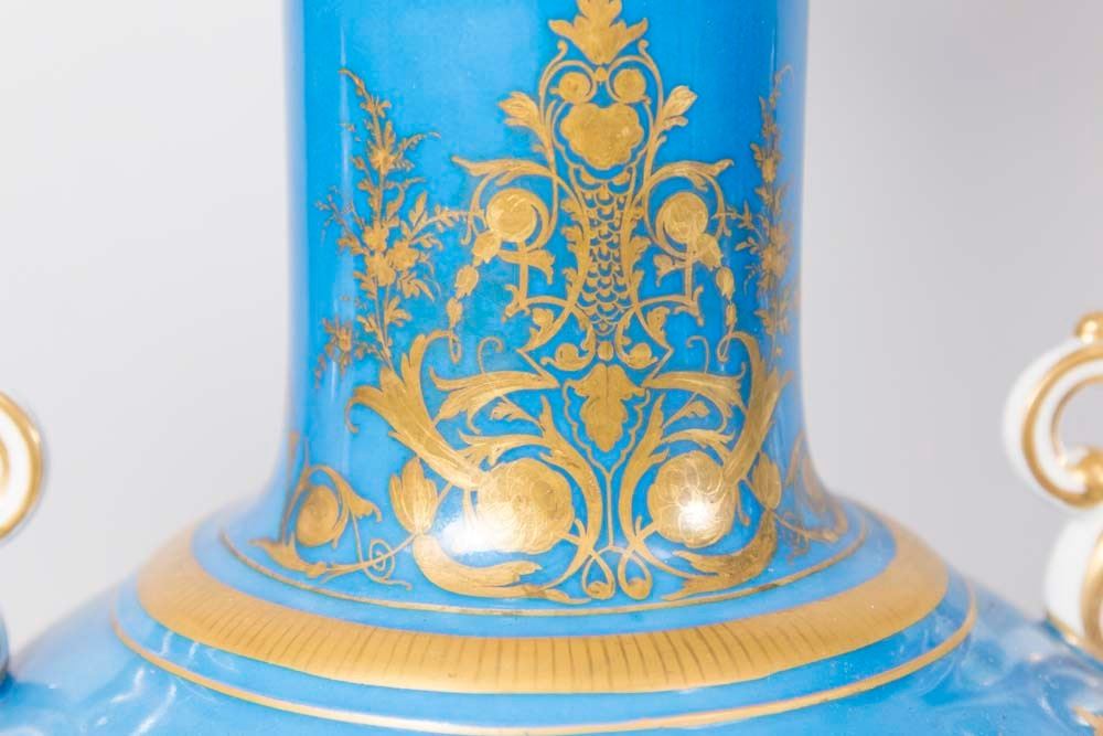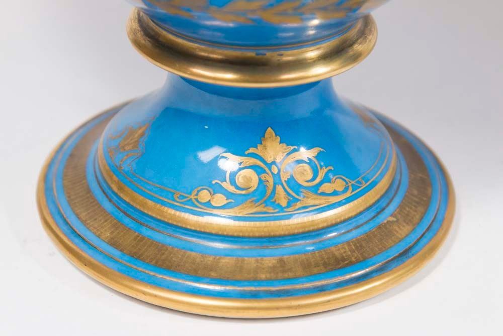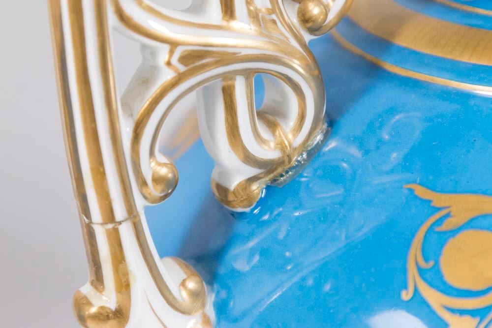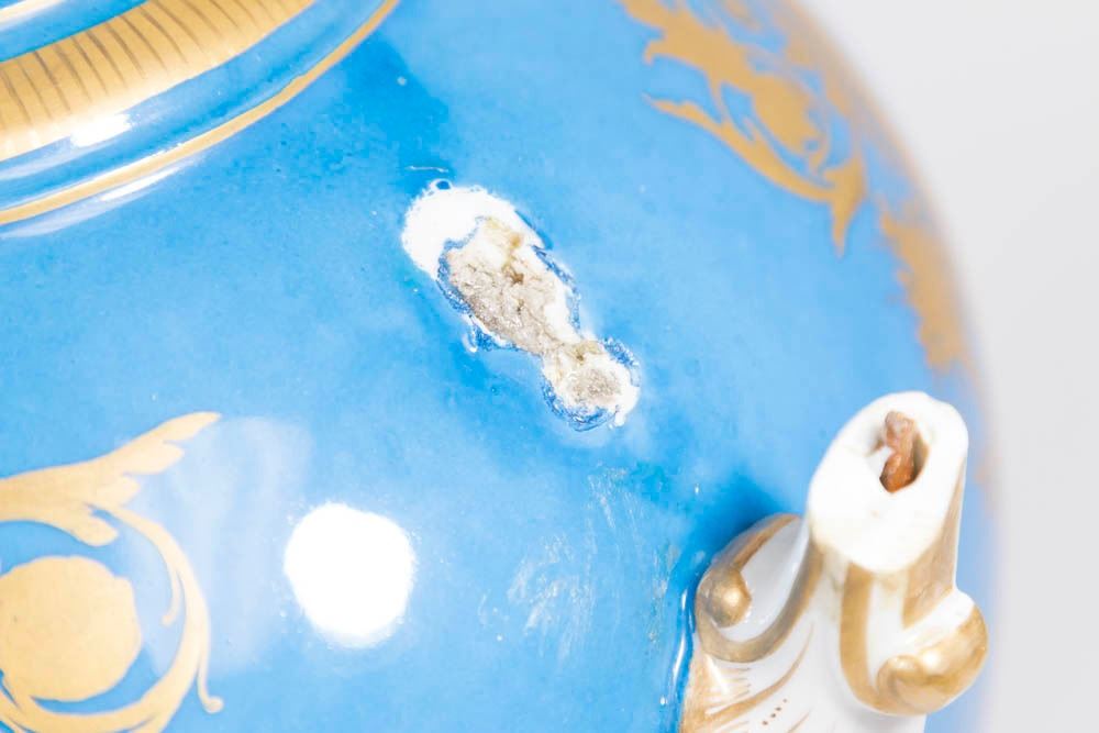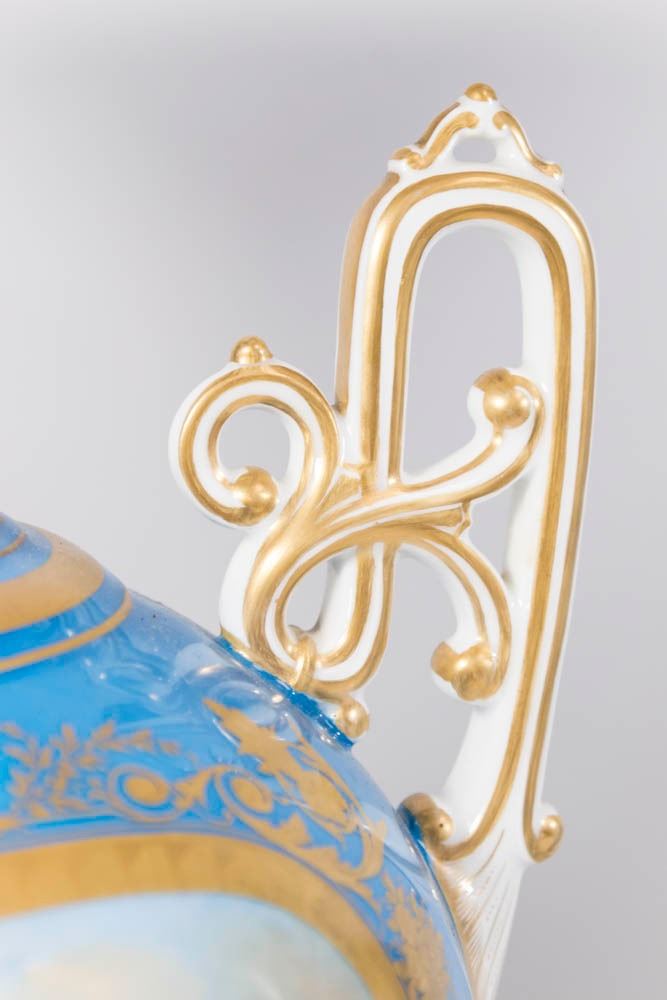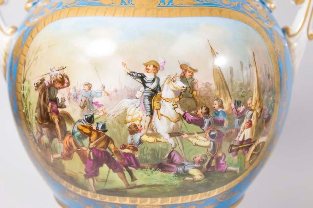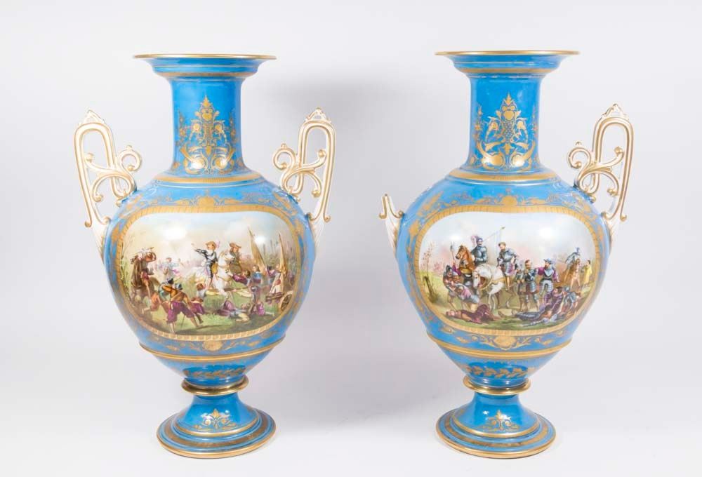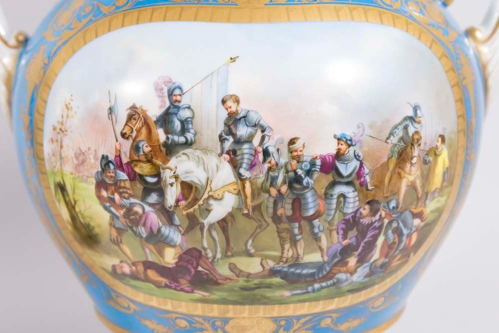 Turquoise ground. Decorated with battle scenes. Approx. 18 1/4" H. From an Edgewater, NJ estate. 1 handle broken. Missing pieces.