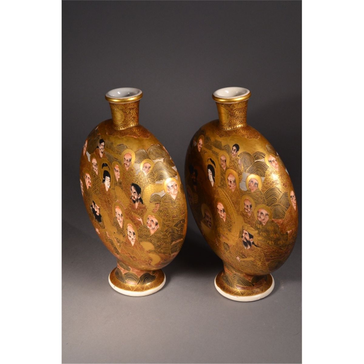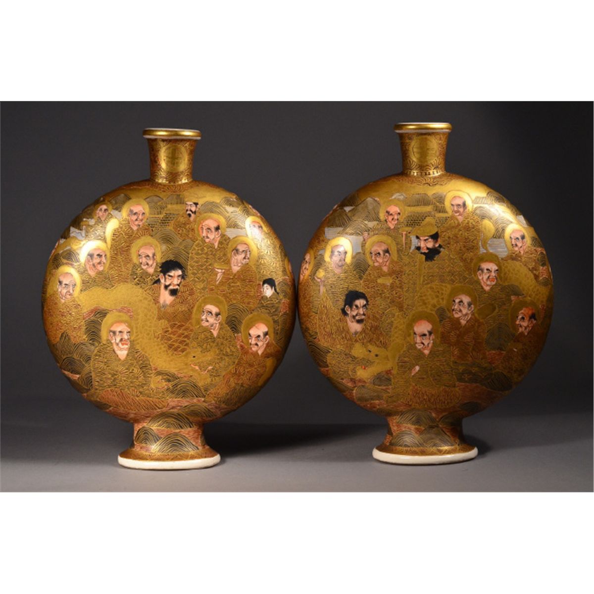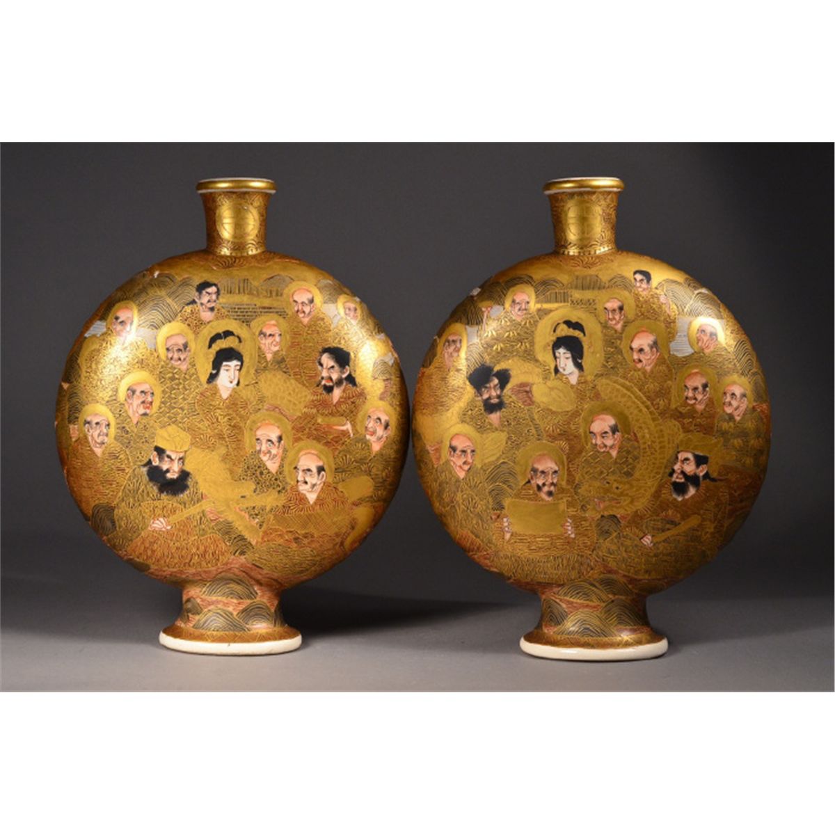 Pair of Japanese Satsuma "pilgrim's" flask; of flattened form: both sides featuring figural scene of court attendants, emperor and empress, all reserved on gold colored ground; mark on base, 19th Century | 12" tall, 9" wide