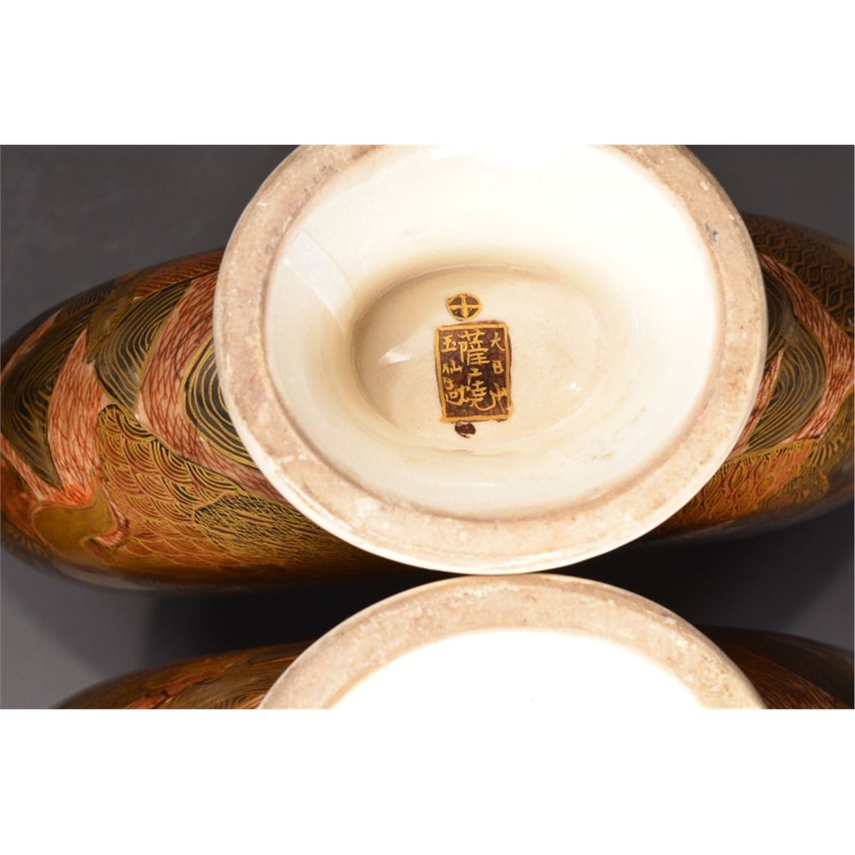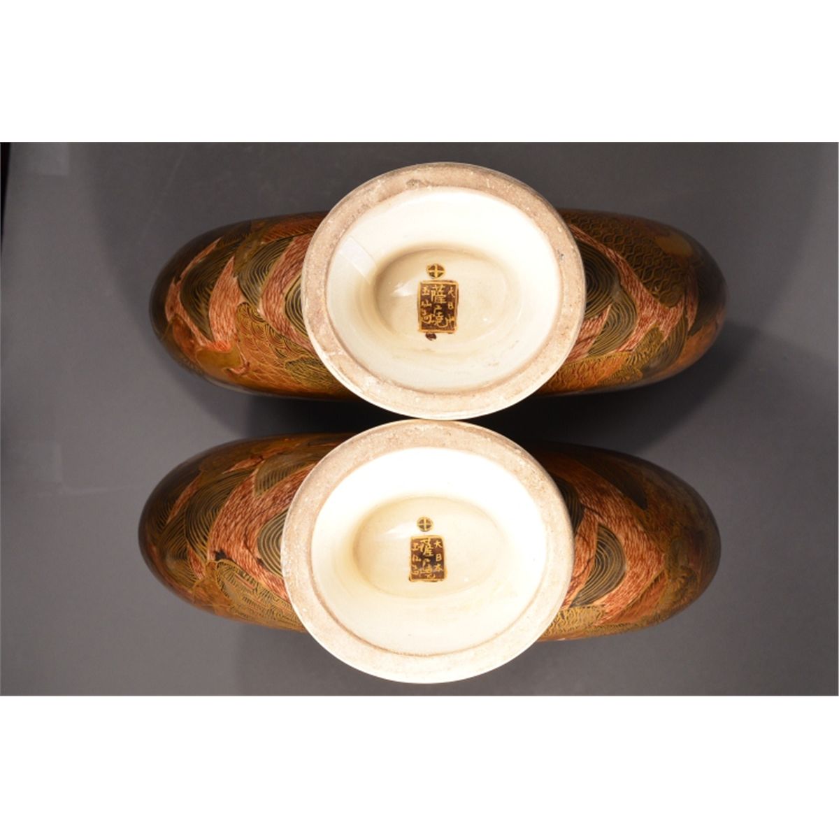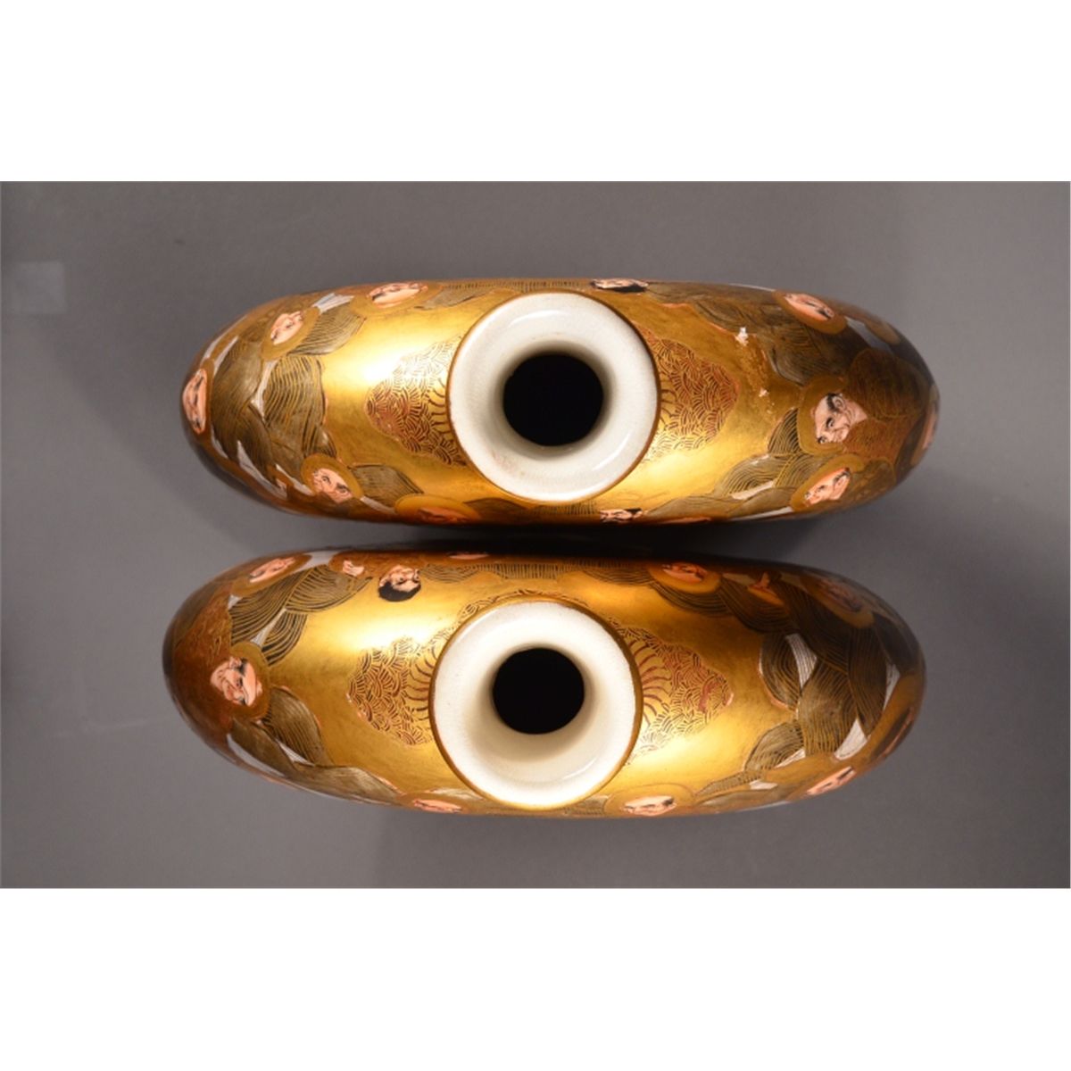 Pair of Japanese Satsuma "pilgrim's" flask; of flattened form: both sides featuring figural scene of court attendants, emperor and empress, all reserved on gold colored ground; mark on base, 19th Century | 12" tall, 9" wide