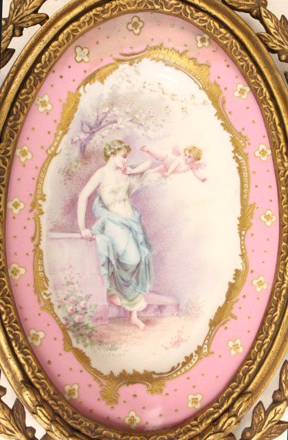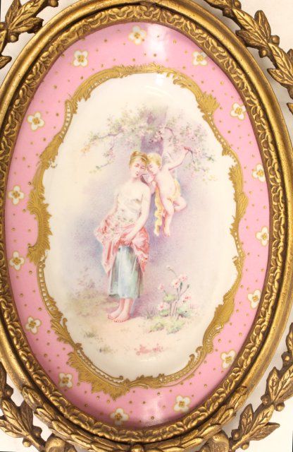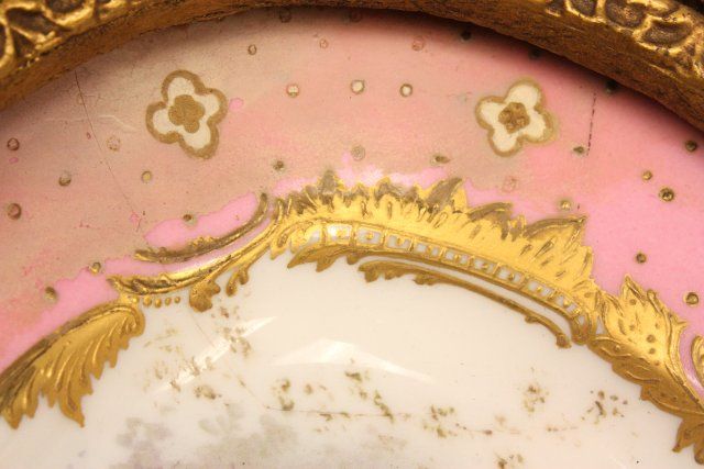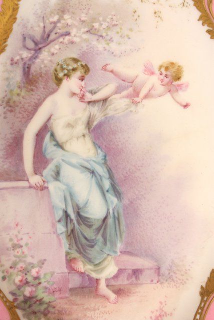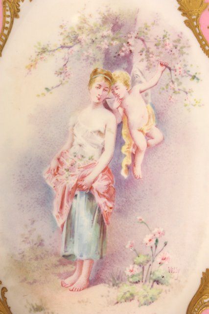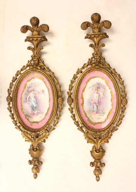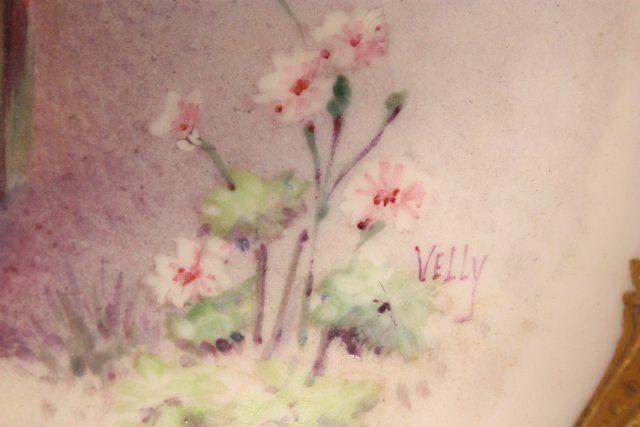 Handpainted. Artist signed Velly, mounted in gilt fleur de lis frames, 1 plate is repaired. Frame approx. 33.25" H, plates 8" x 12". Please read our terms of sale.