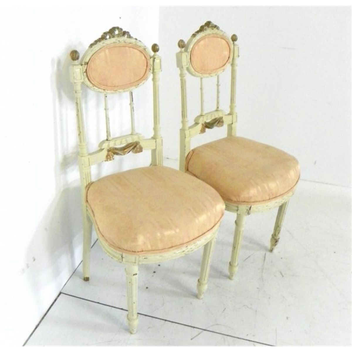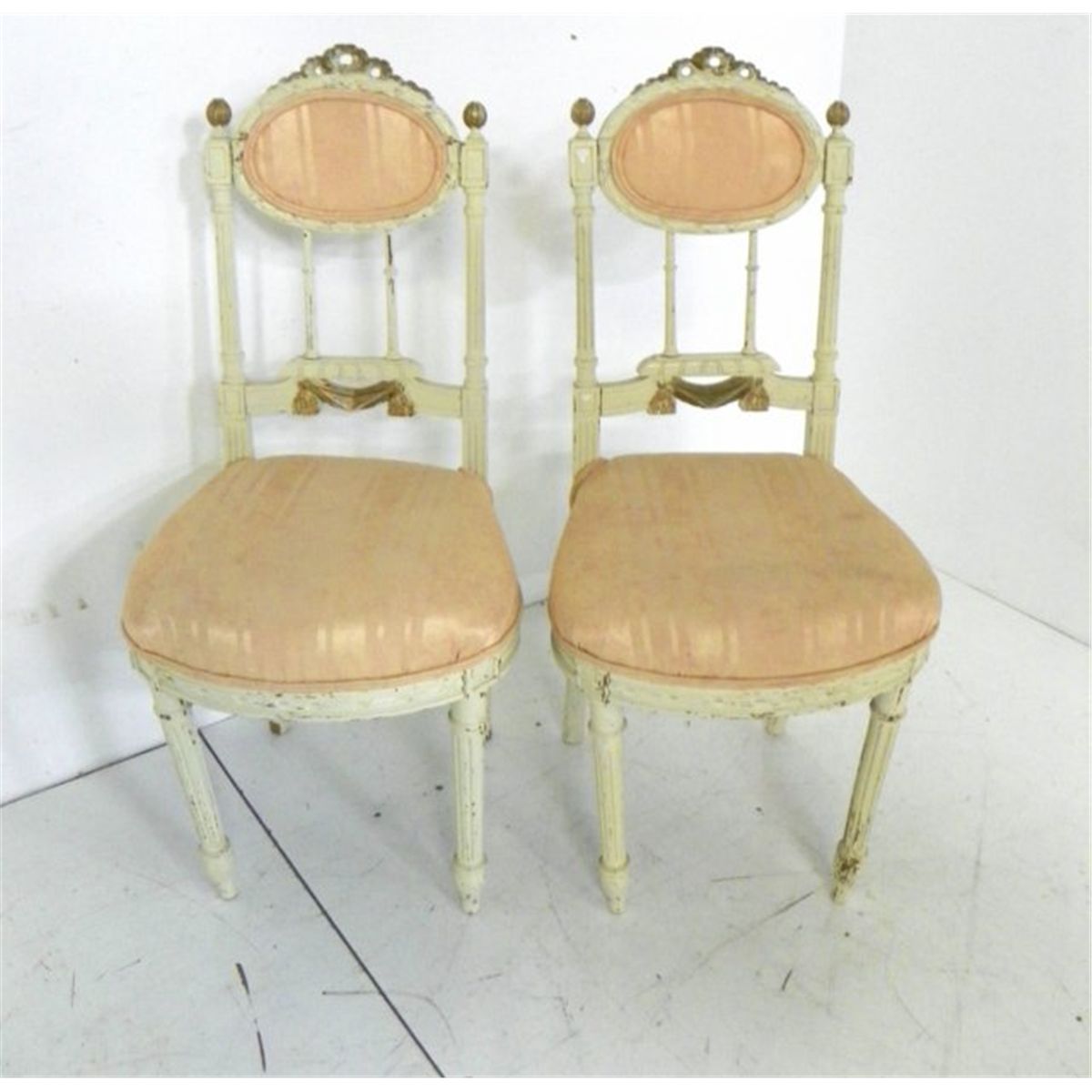 Painted white with  gold, pink striped upholstery.   Approx. 36" H x 15" W x 14" D. Please read our terms of sale.