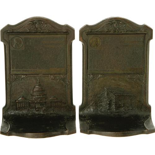 <B>Pair of Abraham Lincoln Gettysburg Address Bookends.</B></I> These heavy cast (4.5 pounds each) bookends feature an eagle perched atop a plaque with a 1909 Lincoln cent and the entire text of Lincoln's famous speech. Beneath on one is Lincoln's log cabin birthplace in Hodgenville, Kentucky and on the other is the U.S. Capitol in Washington symbolizing his rise from humble beginnings to the highest office in the land. 4.5" x 6.5" tall x 3.25" deep with felt-covered backs and bottoms. Excellent condition and very possibly from the 1909 Lincoln Centennial period.<BR><BR><b>Shipping:</b> Miscellaneous Collectibles, Larg (<a target="_blank" href="http://www.heritageauctions.com/common/shipping.php">view shipping information</a>)