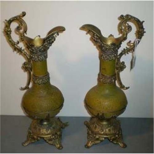 </font></strong>Pair of fantastic ornate metal painted ewers. These were used on fireplaces as status symbols. Beautiful condition and mustard color there is only one slight separation of the metal handle from the piece going around the neck of the ewer. Its not hardly noticable. No makers marks as they are pre-1895.</font>