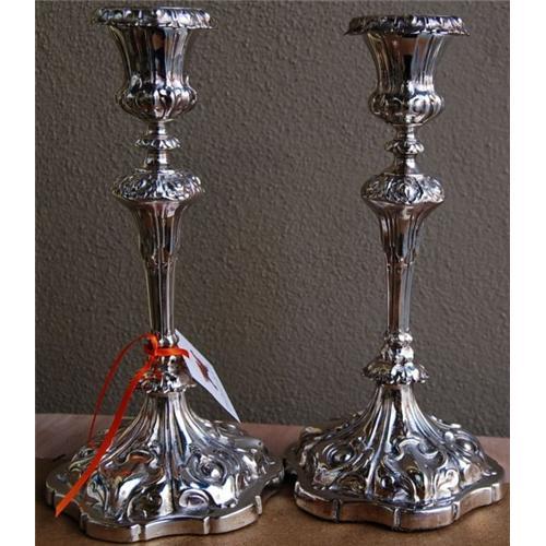 Pair Antique Sheffield Candlesticks, c. 1830. Silver on copper. In