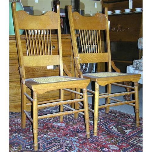 Included here is a matching pair of oak side chairs with rattan seats from the arts and crafts period. Each measures . These chairs reside on the upper west side of Manhattan ( New York city ) and may be seen by appointment.