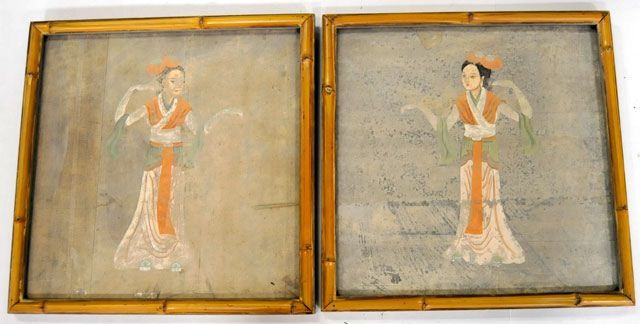 Later mounted on board, framed under glass, paintings are unsigned & apprear very old, some losses to paint. Approx. 18.5" x 18.5". Please read our terms of sale.