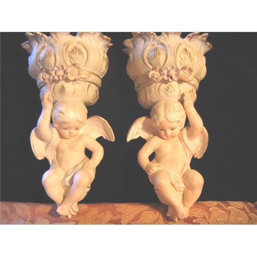 This is a beautiful vintage pair of wall pockets, made by ArtMart I believe (there is a small part of the lable on the back), numbered 7942. The initials NSR are also on the back. The cherubs are holding the vase on their little heads. Their eyes gaze downward. The vase, which is styled acanthus leaves, and the wings are accented with gold. They are softly painted in light colors, which can't be seen in this photo because I had to lighten it. They are in near mint condition, except that a small piece of the top edge of the vase at the back is chipped off. I have looked at these darling figures many times, and only just noticed this because it is in a well hidden spot.