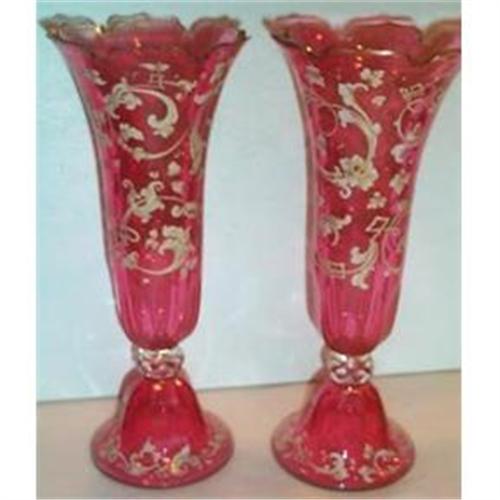 <tr><td>Title:Pair Blown Cranberry Enameled Vases</td></tr>