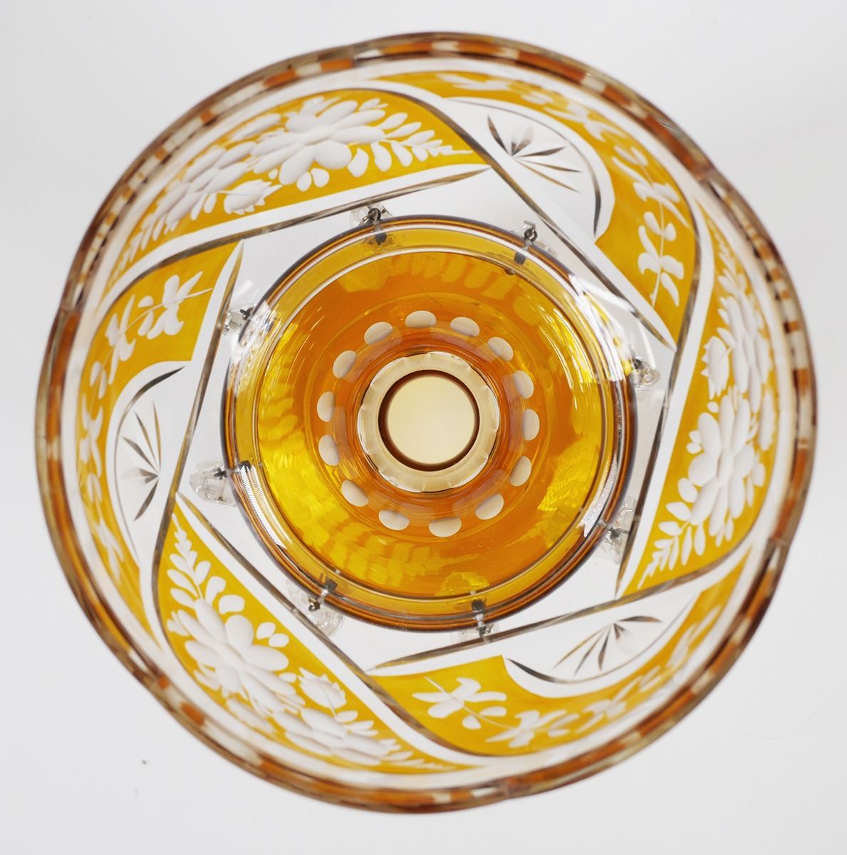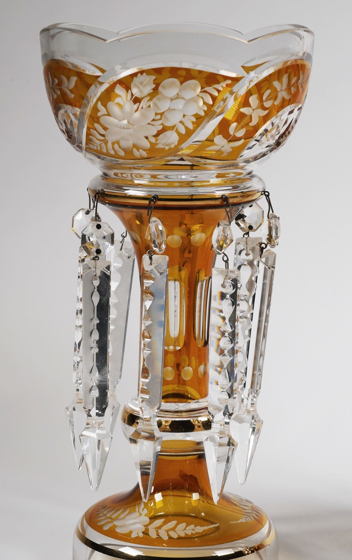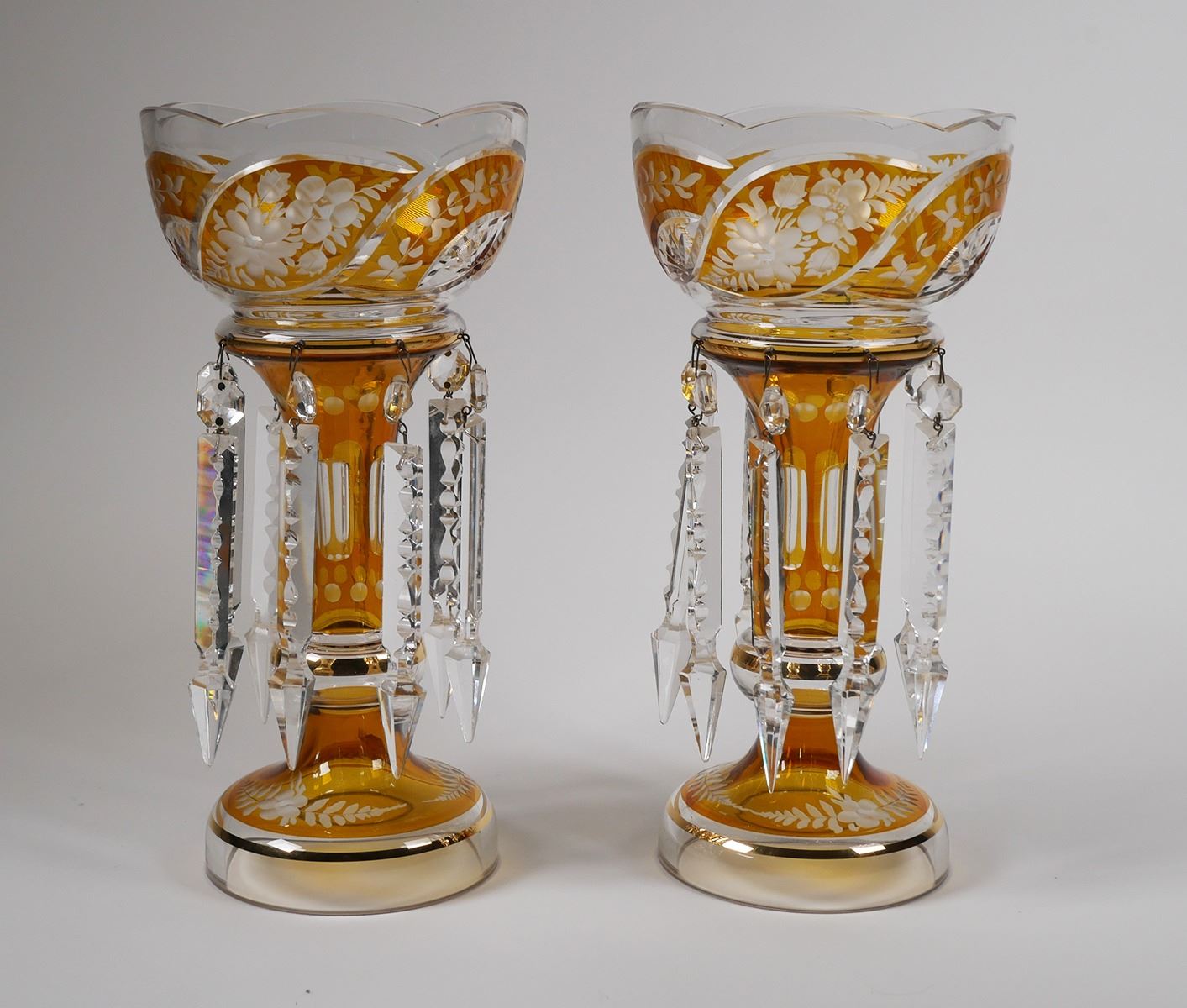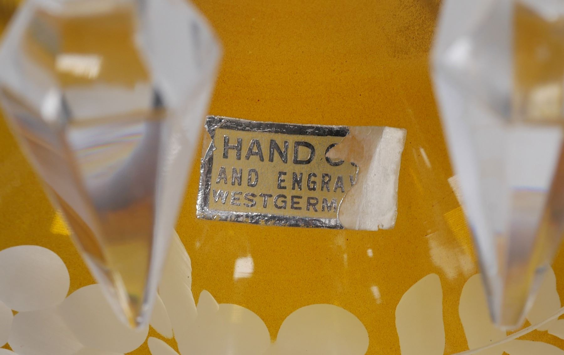 Pair vintage Bohemian/Czech style cut crystal lusters with dangling spear prisms. Foil label "Hand Cut & Engraved, West Germany." Fine condition, with no damage. 12" high.