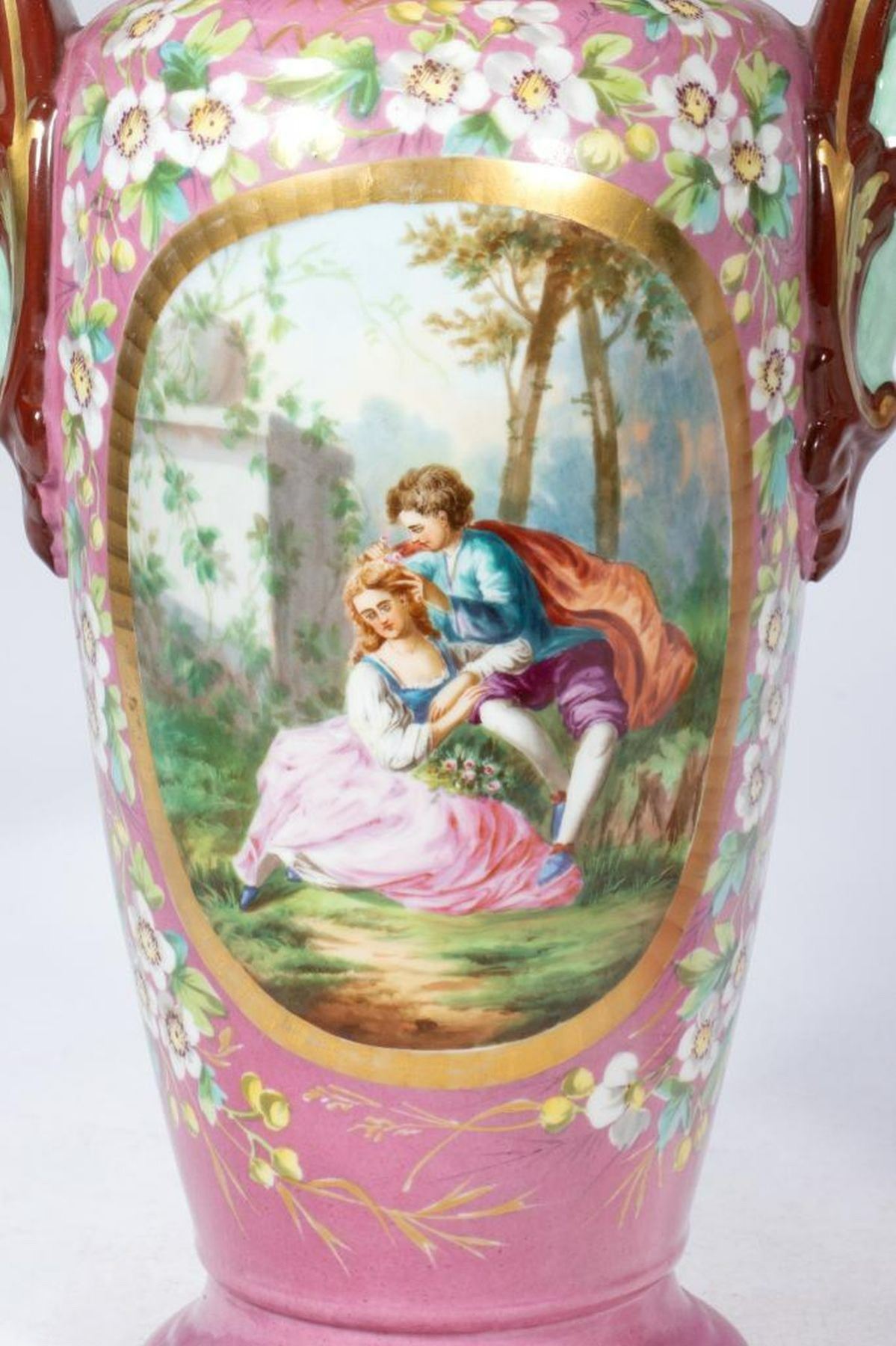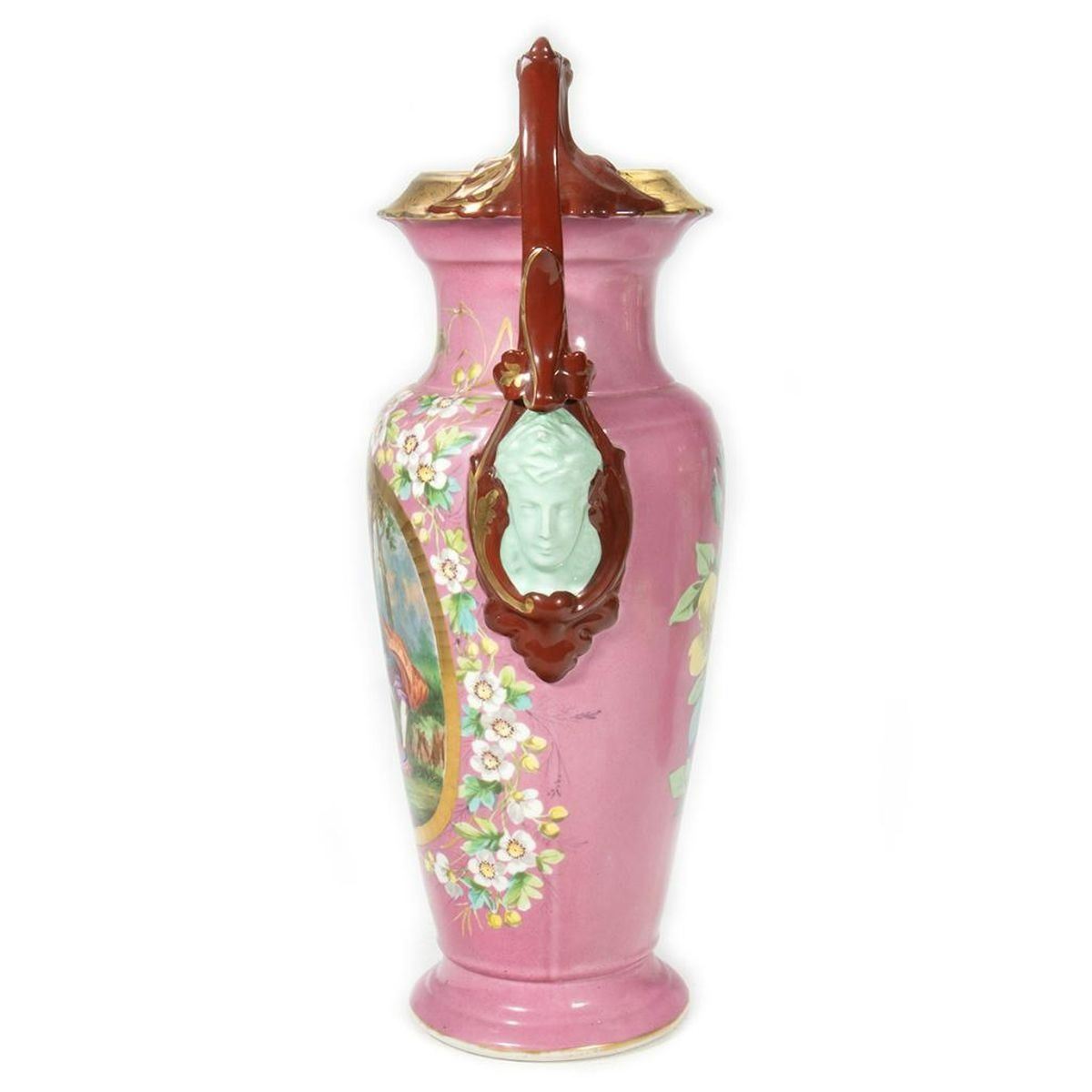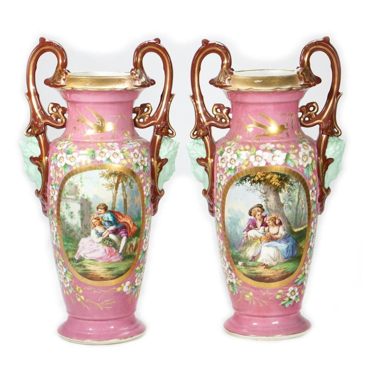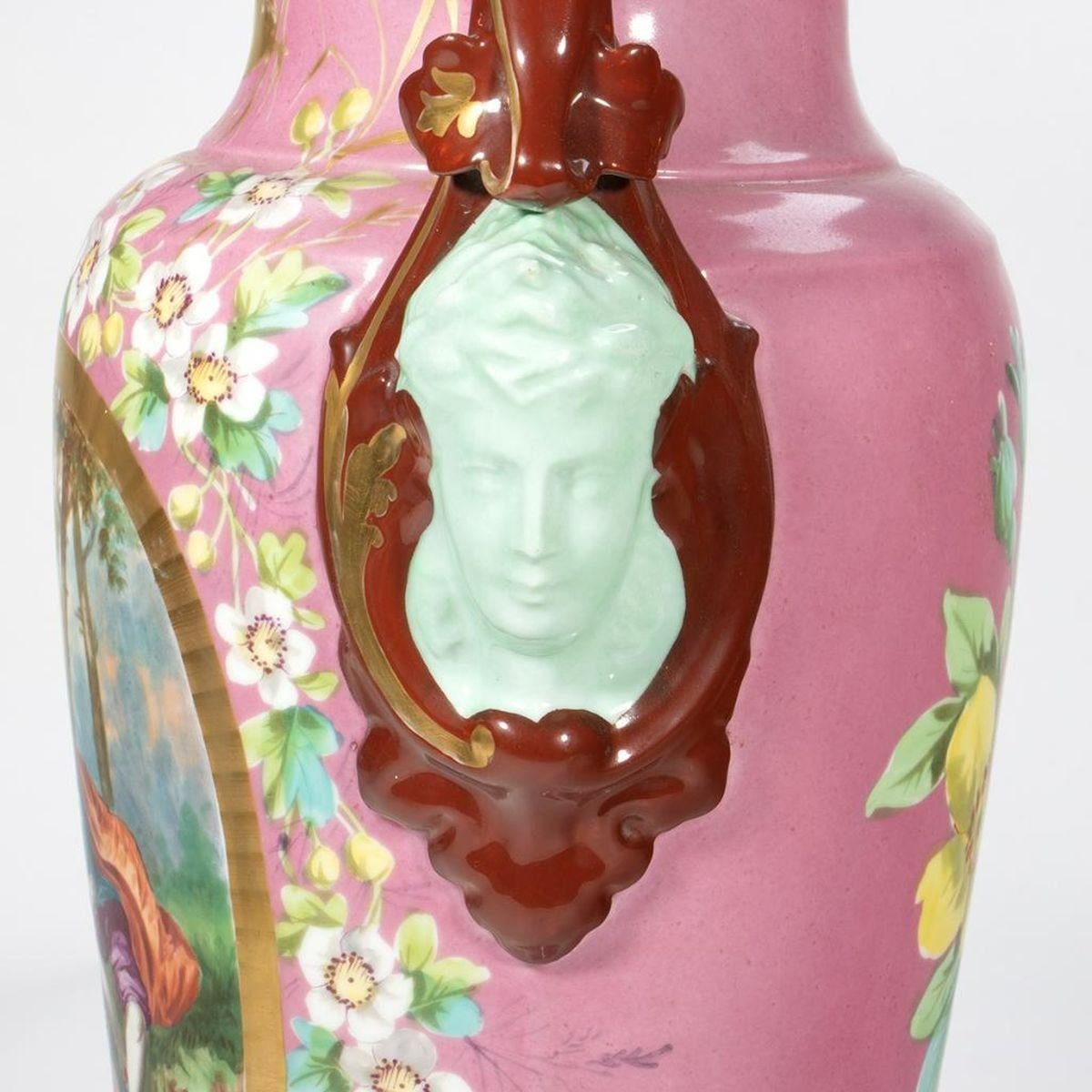 Each rose color urn form with shepherd's hook handles and a Classical mask, centering a cartouche of a romantic idyll within gilt and floral decoration. 21in. h. Condition: Good, very minor rubbing to the gilding on rim.