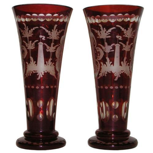 <tr><td>Title:Pair Bohemian Ruby Flashed Etched Vases</td></tr>
