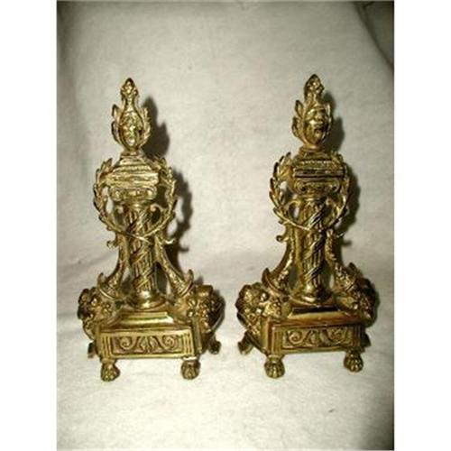 Pair of brass chevets from France C.1900 stand on claw feet with ornate pedestal as center point. Laurel wreath design with decorative finial. Sure to enhance any fireplace or can also be used as tall bookends. Excellent condition,good weight. Measure 13.5H X 7L X 3D.