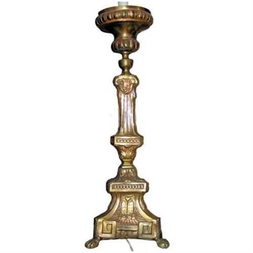 Included here are two matching, Christian (Catholic or Protestant) ecclesiastical brass lamps from the early 20th century. (Only one lamp is shown. Other lamp is in comparable condition.) These hand-hammered brass lamps feature the designs each of the three panels at the base, including two tablets representing the ten commandments, a lamb representing Jesus, and a triangle with sunburst behind representing the holy trinity. Each are in good working order. Both stand firmly on three animal paw feet, but tilt a bit as seen in our images. Each measures approximately 40" tall (27" from base to top of brass, excluding light fixture). Triangular shaped base measures 9.5" from corner to corner. Origin and maker are unknown.