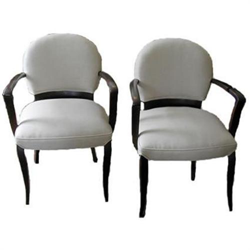 Pair Bridge Chairs: French; c.1930-1940; Linen upholstery; Rare Back Detail; W: 22", H@Back 33", W@seat 19", H@seat 19"