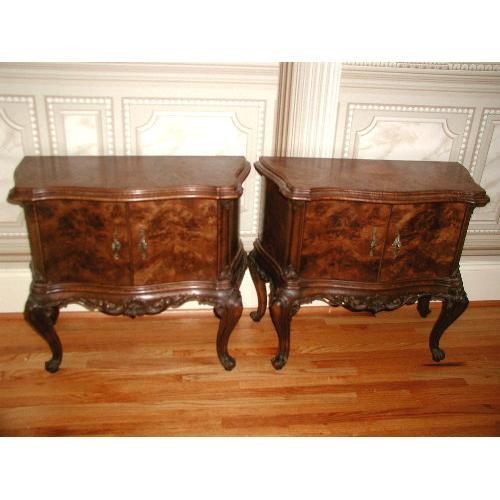 Additional photos available. Pair of truly magnificent hand made Italian walnut burl side tables,end tables or night stands C.1865-70. The richly toned burl is booked and matched on top,sides and double doors with the pair matching each other perfectly. The walnut legs and thick pierced rococo apron are expertly carved with intricate detail. Mitered corners with additional carving top and bottom at the front of the flare to wall sides.Original brass finger pull hardware on doors with good storage on interior. The pair are in pristine condition,sure to accent any room turned sideways or straight. Each measure 27L at wall side,23L at front,12D X 23.5H.