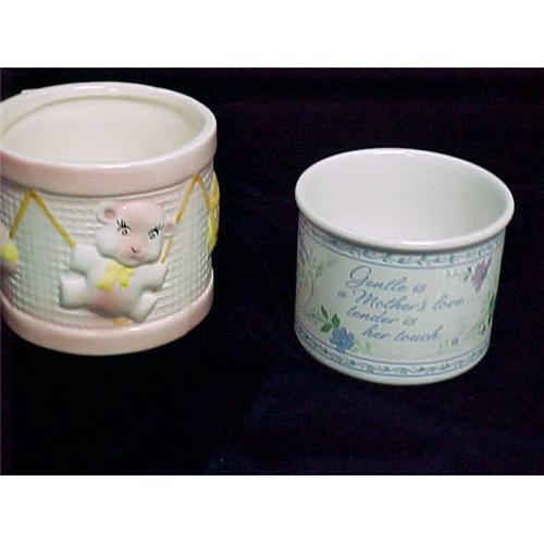 </font></strong>Pair Ceramic Planters-For Mothers and Babies! A delightful pair of contemporary planters. One says "Gentle is a Mother's love, tender is her touch" in blues and lavenders and greens. The other is a multi colored pink, yellow, blue planter for new babies! One made in China, the other a Hallmark, made in Japan. Nice pair!</font>