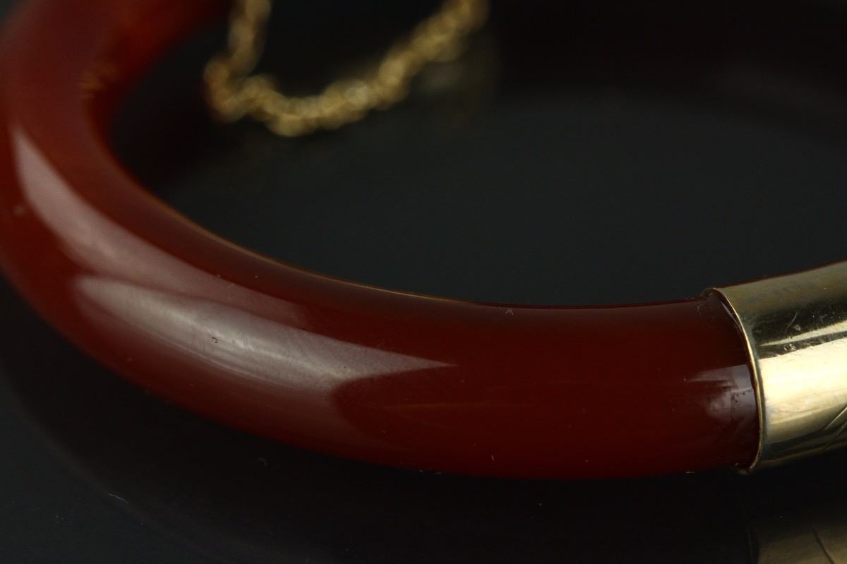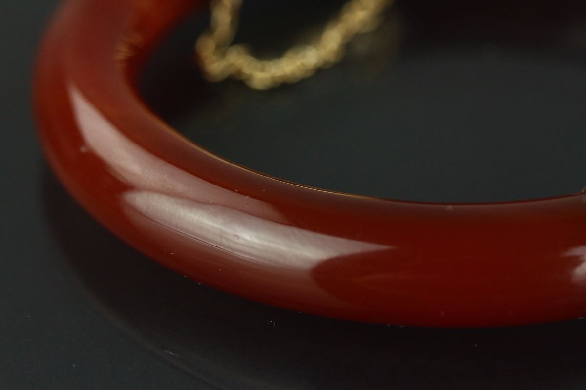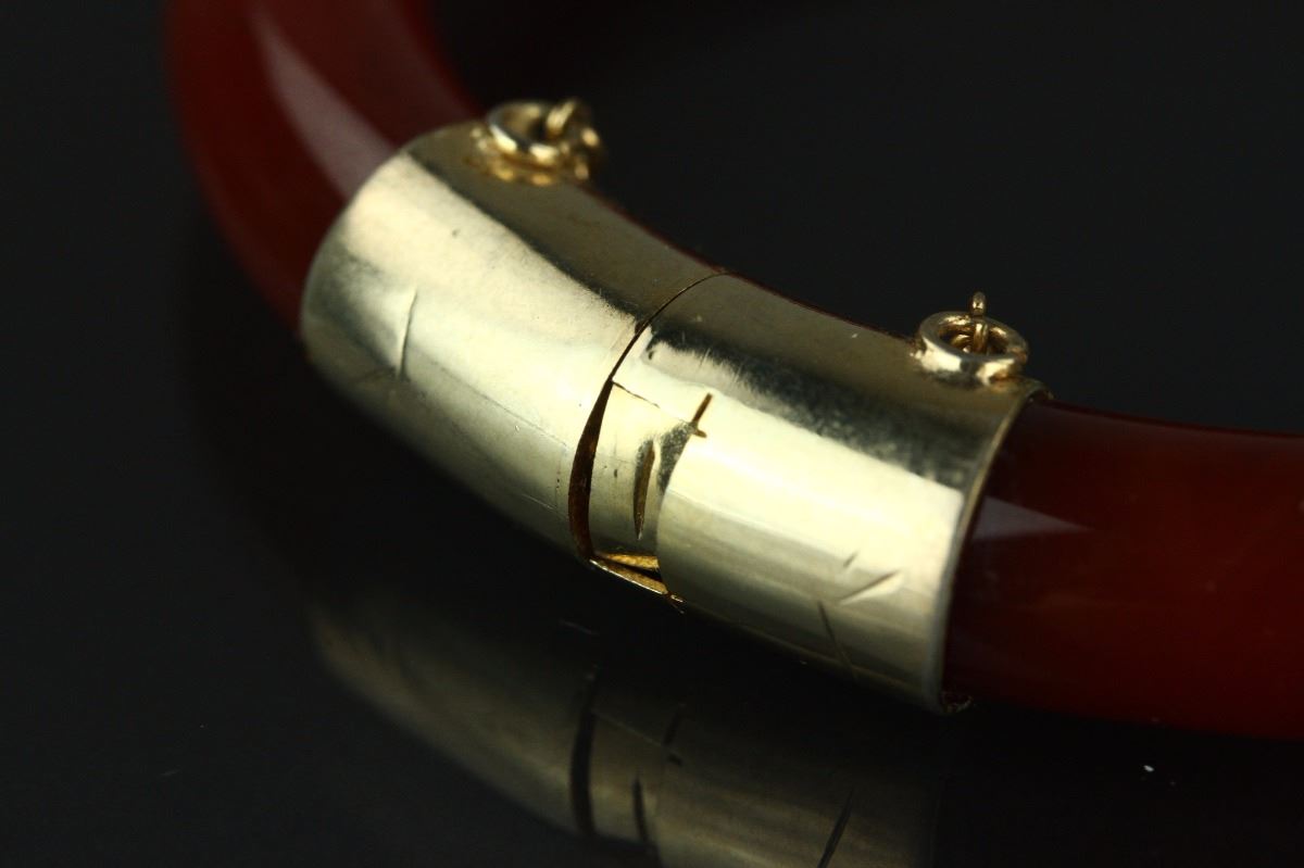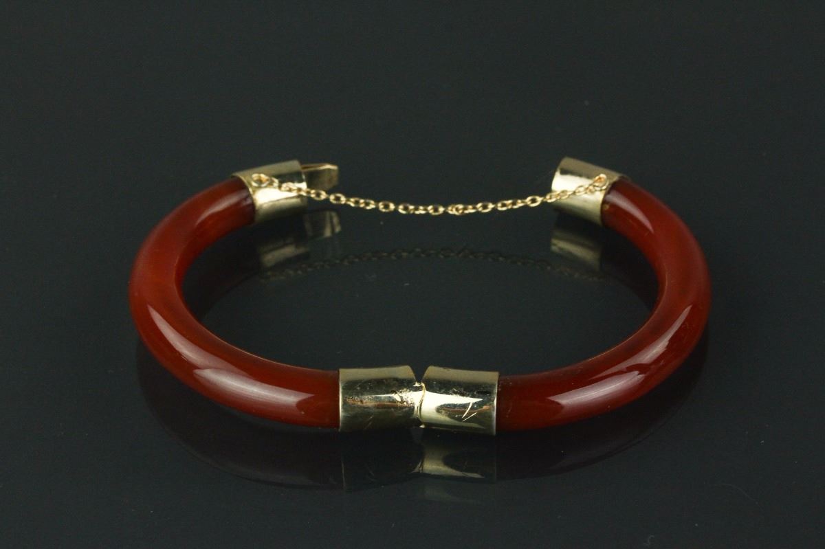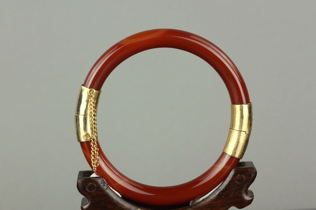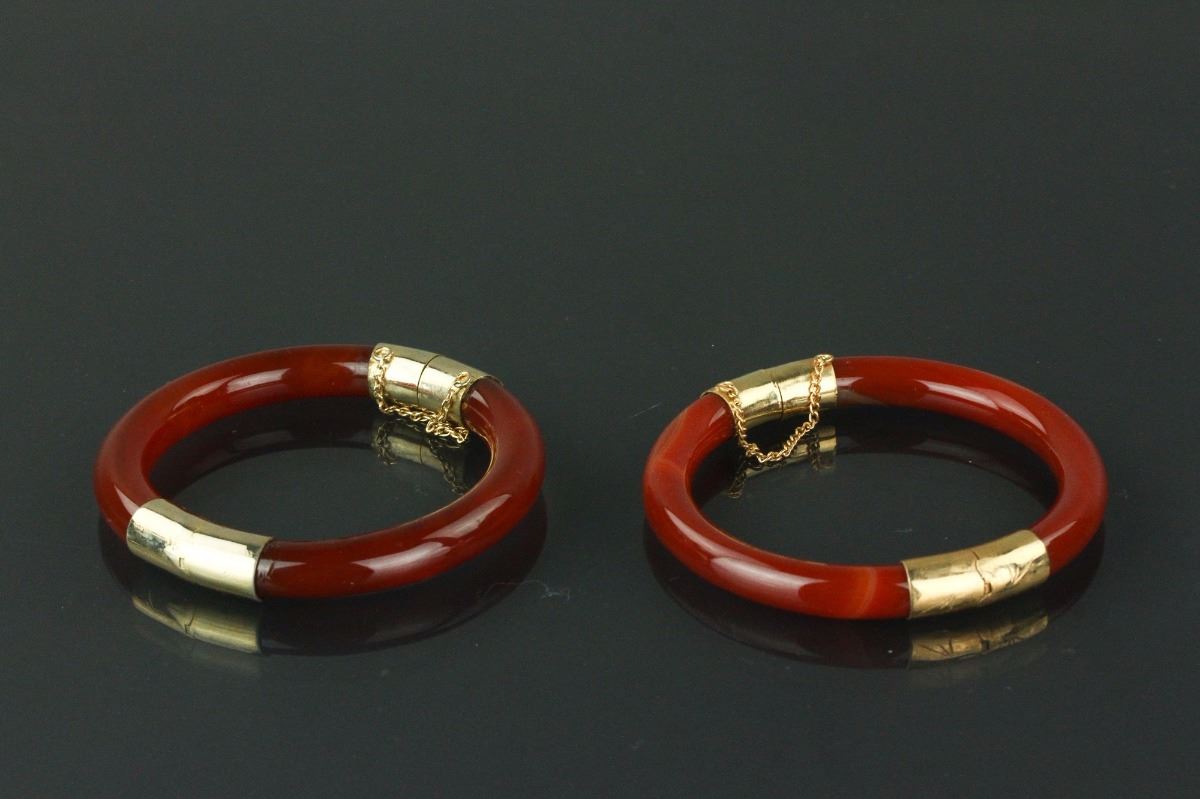 Pair of Chinese agate bangles; of rounded edge; with gilt clasps; of crimson tone; D: 6 cm (inner size), 76 grams (both)