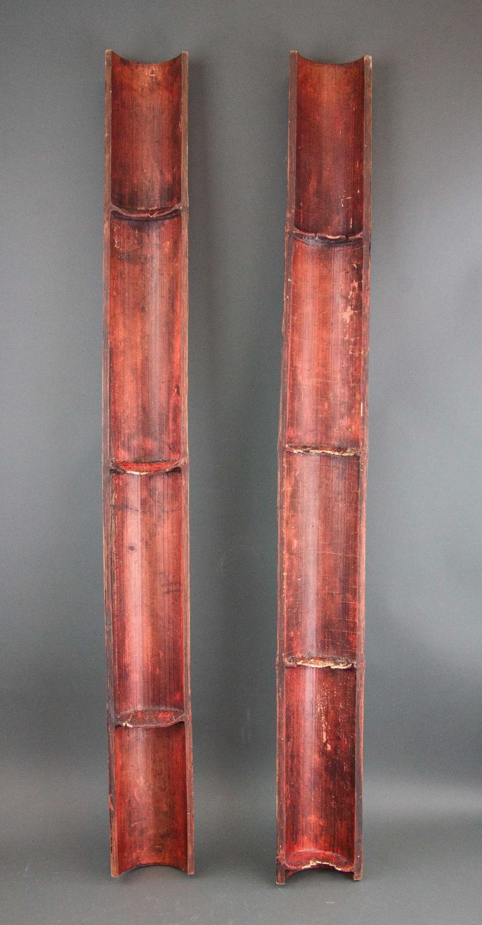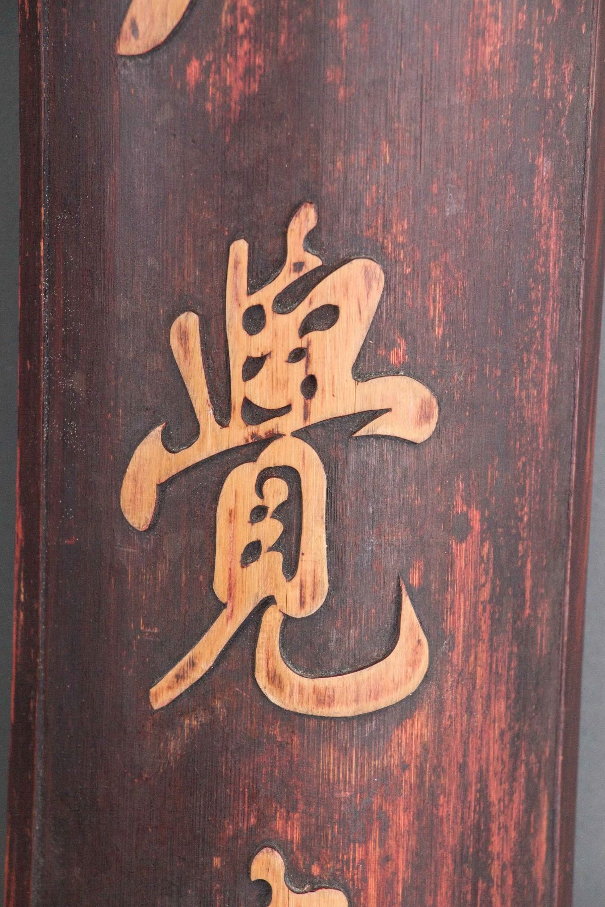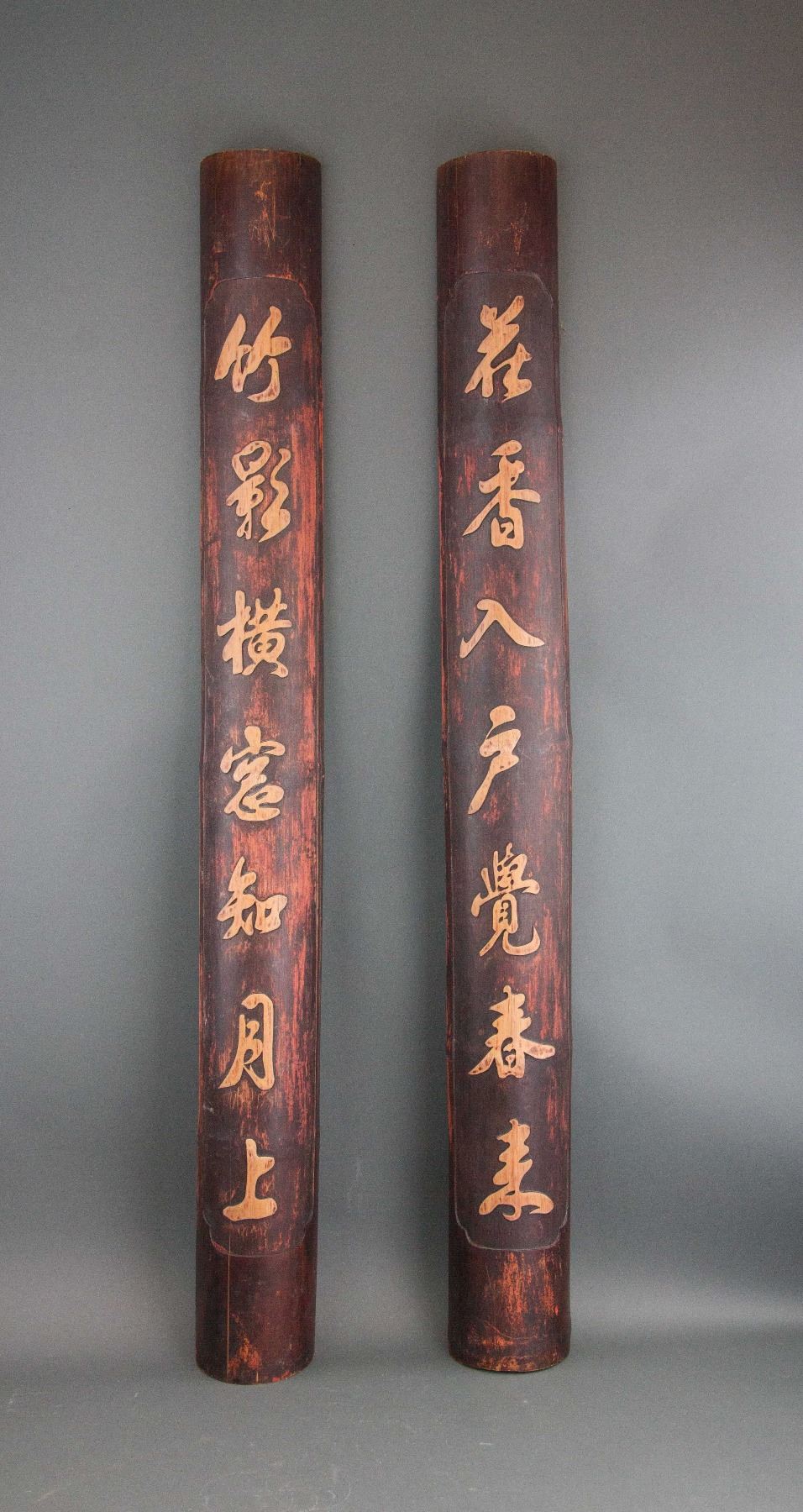 One pair of Chinese bamboo calligraphy panel; Chinese characters in semi-cursive script; carved on half-cut bamboo; 111 cm x 11 cm, 1136 grams (1/2), 111 cm x 11 cm, 1150 grams (2/2)