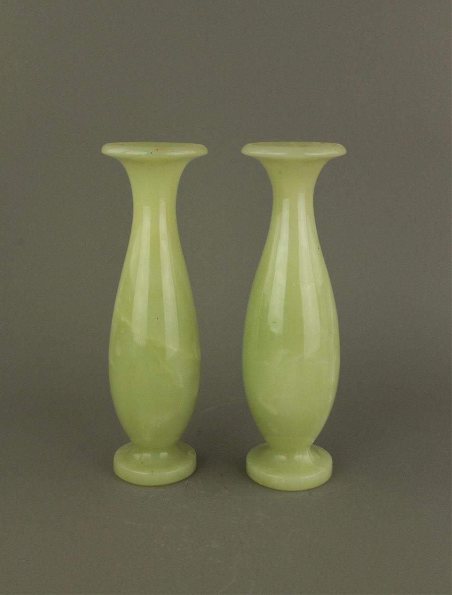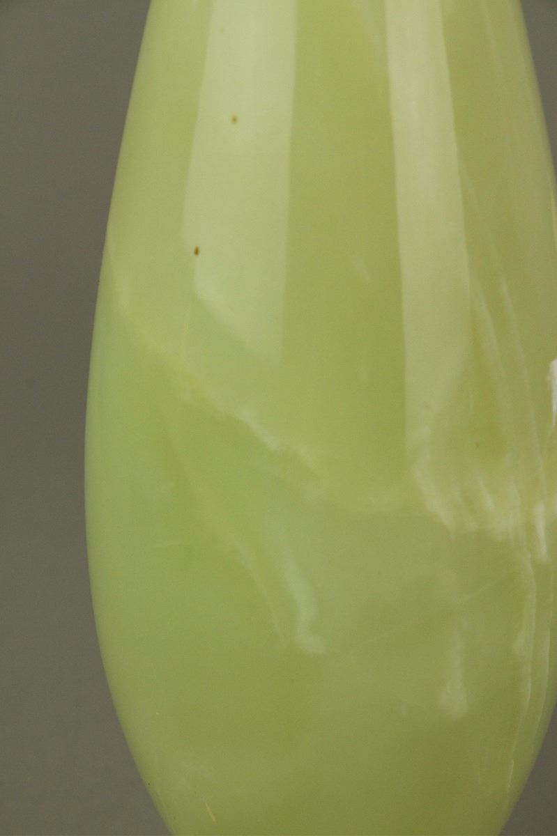 Chinese celadon hardstone vase; of slender baluster form; the stone of light olive green tone suffused with striped pattern; H: 21 cm, D: 8 cm, 1485 grams each
