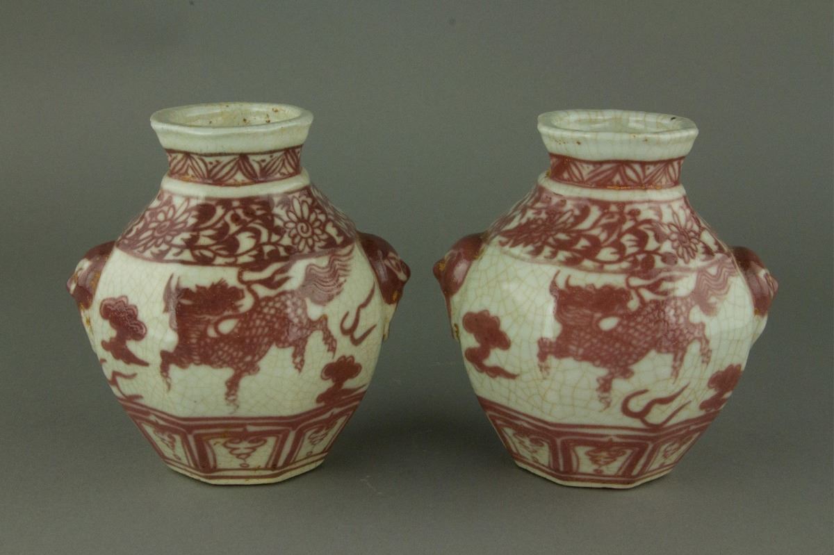 Pair of Chinese copper red porcelain jars; of rounded hexagon body flanked by double lion-shaped handles; painted with Qilin mythical beasts amidst clouds on crackle-glazed ground; H: 12 cm, D: 11 cm, 354 grams each