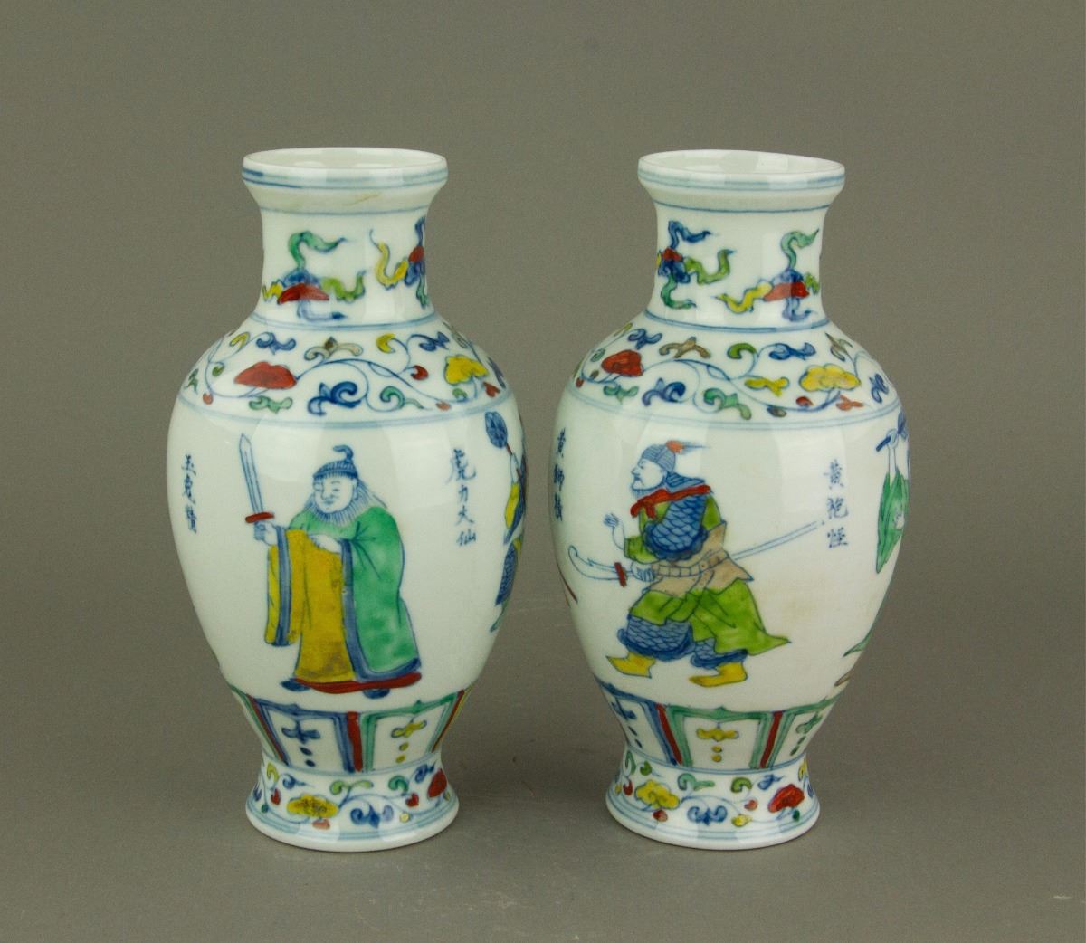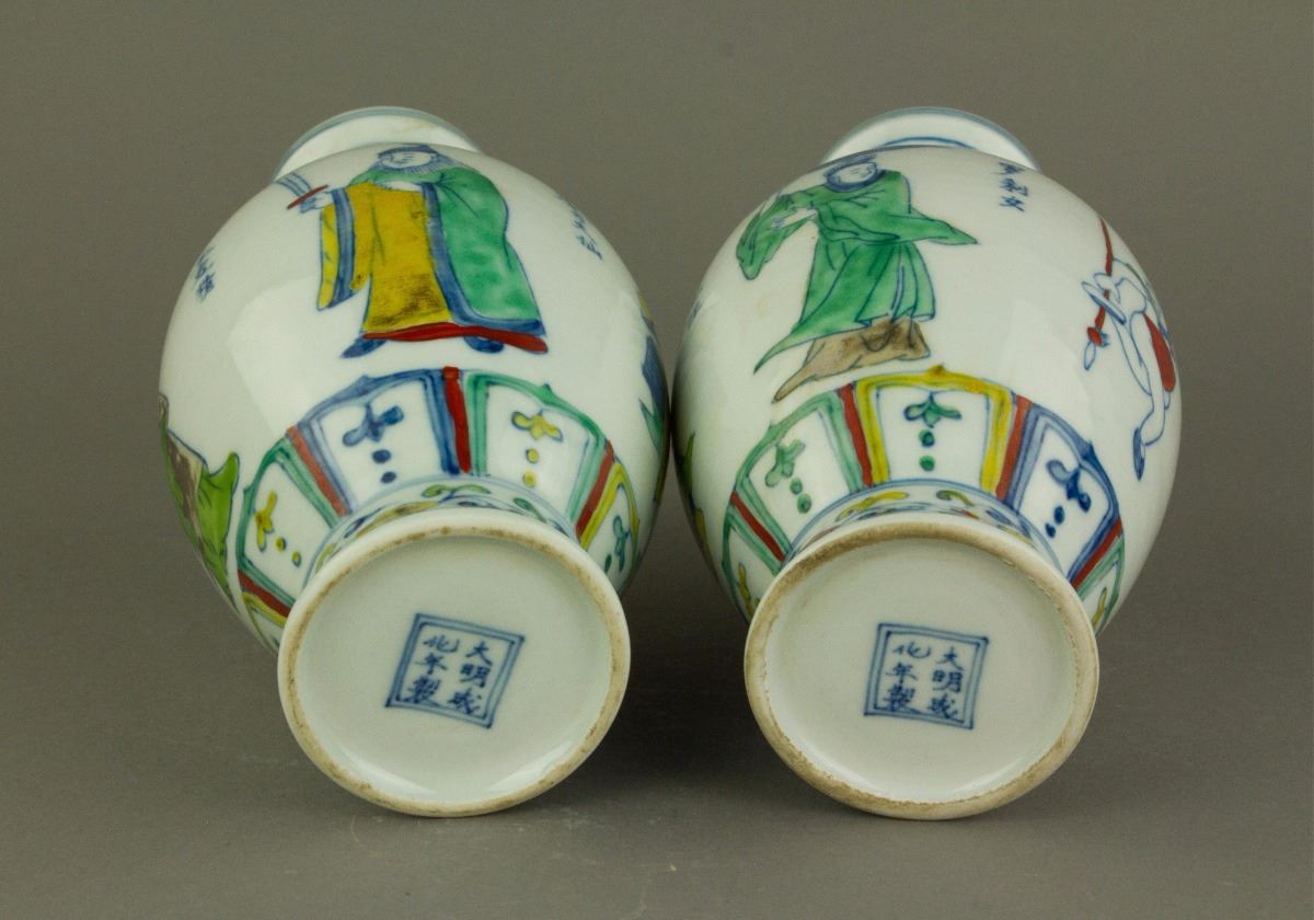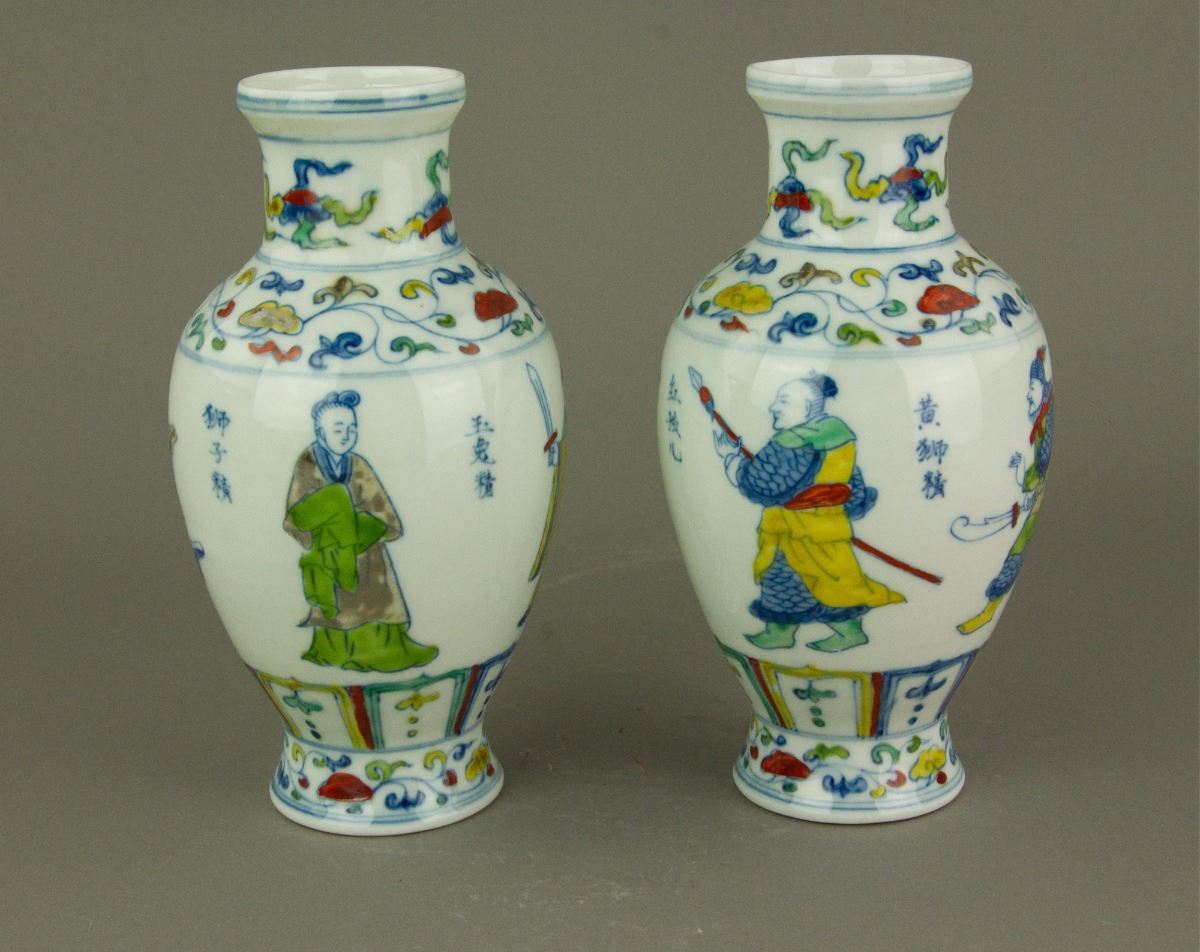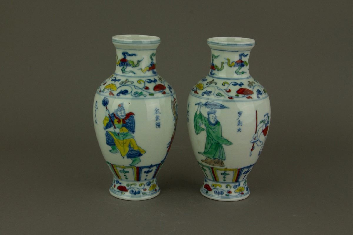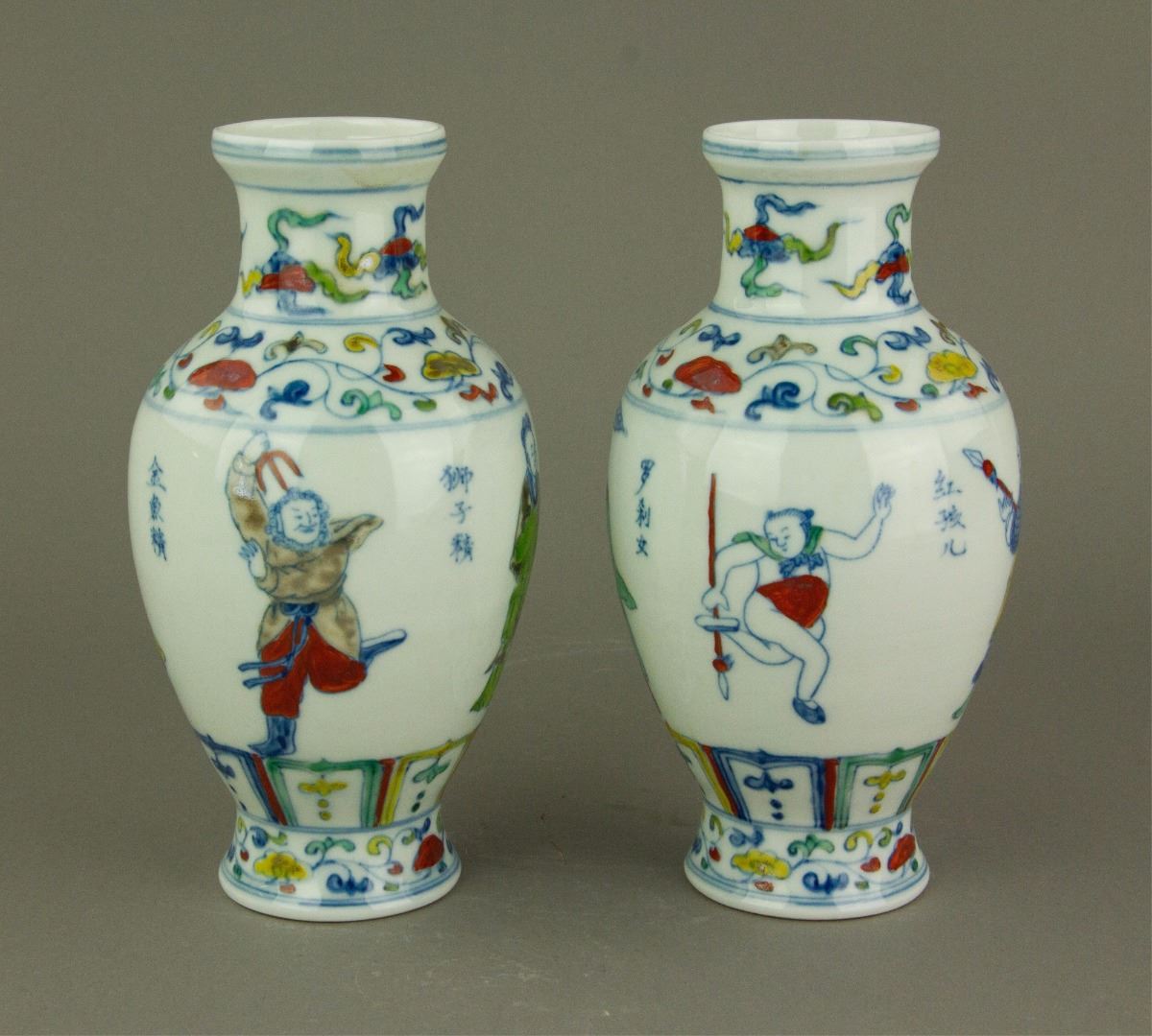 Pair of Chinese Doucai porcelain vases; of ovoid body tapering to a waisted base; featuring monsters in Journey to the West on body; six-character Ming Chenghua mark on base; H: 18 cm, D: 8.5 cm, 449 grams total