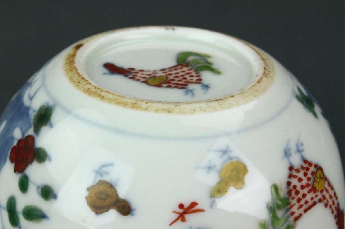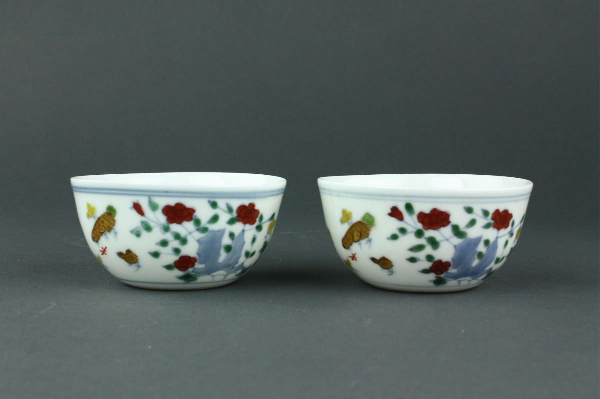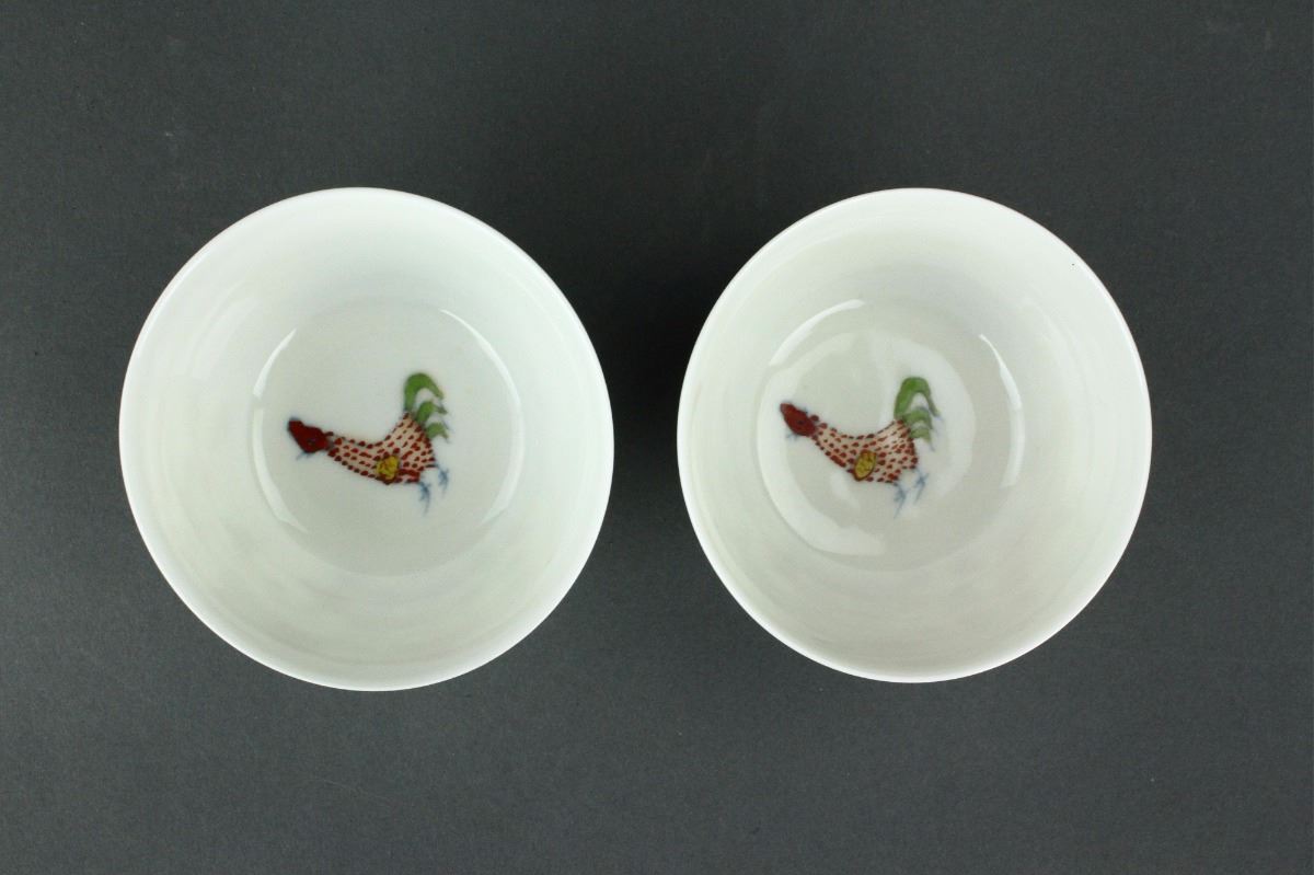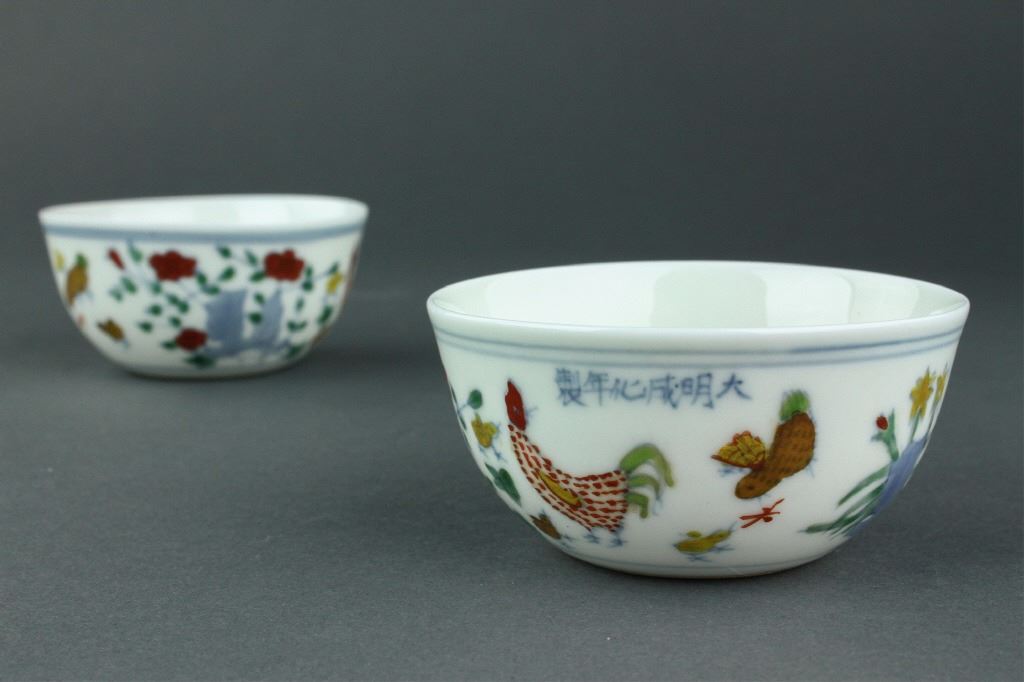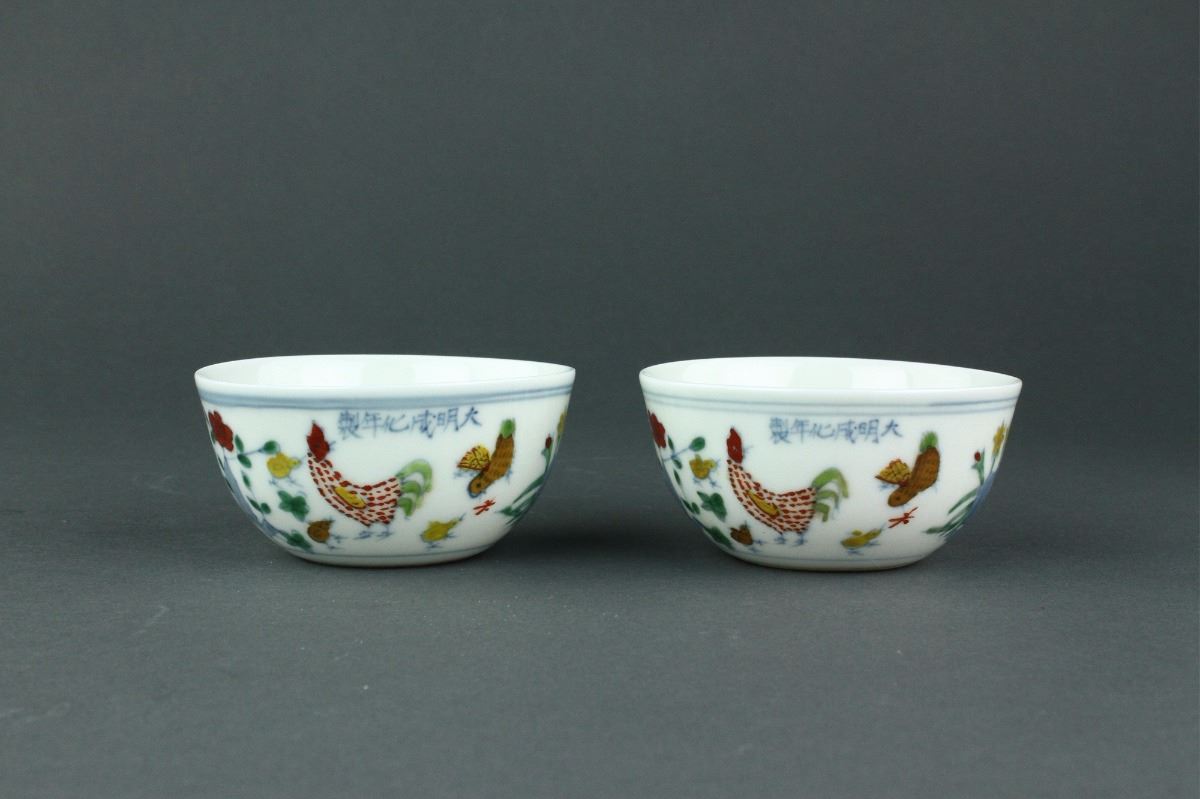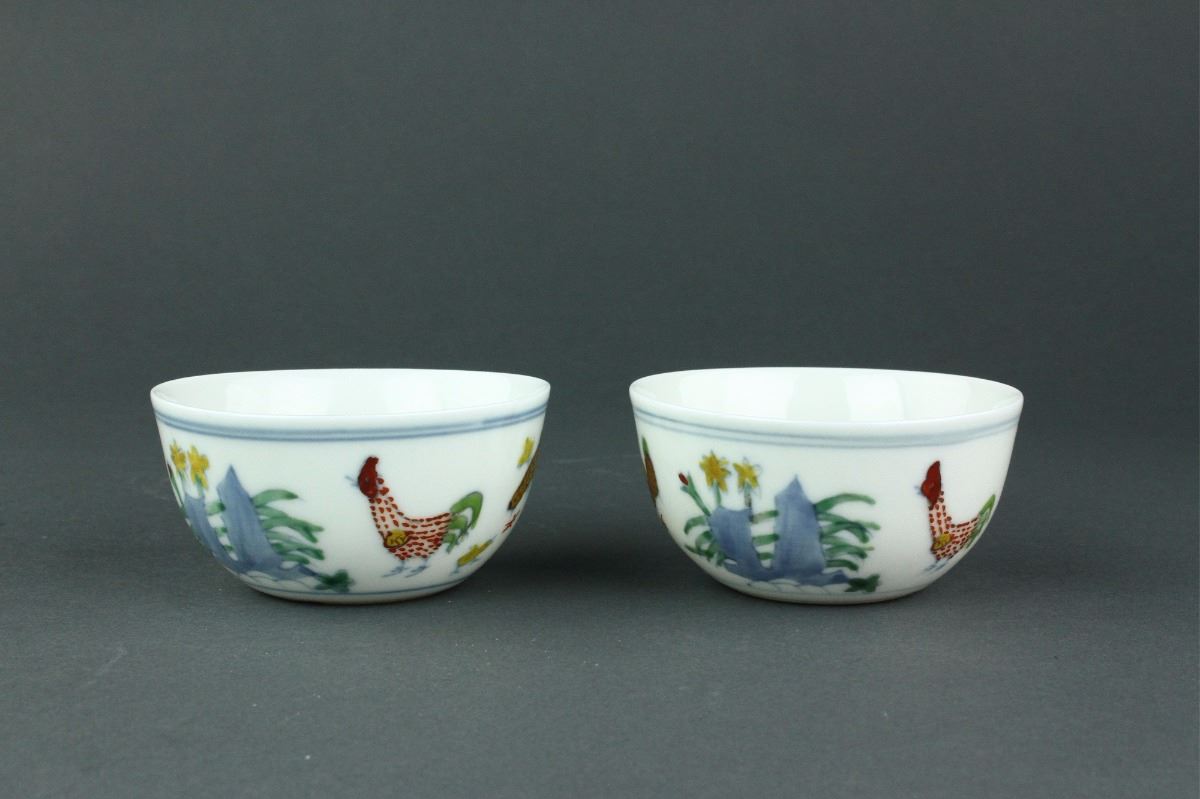 Pair of Chinese Doucai porcelain wine cups; featuring chickens and flowers on body; six-character Ming Chenghua mark on rim; with rooster mark on base; H: 4 cm, D: 8 cm, 112 grams total