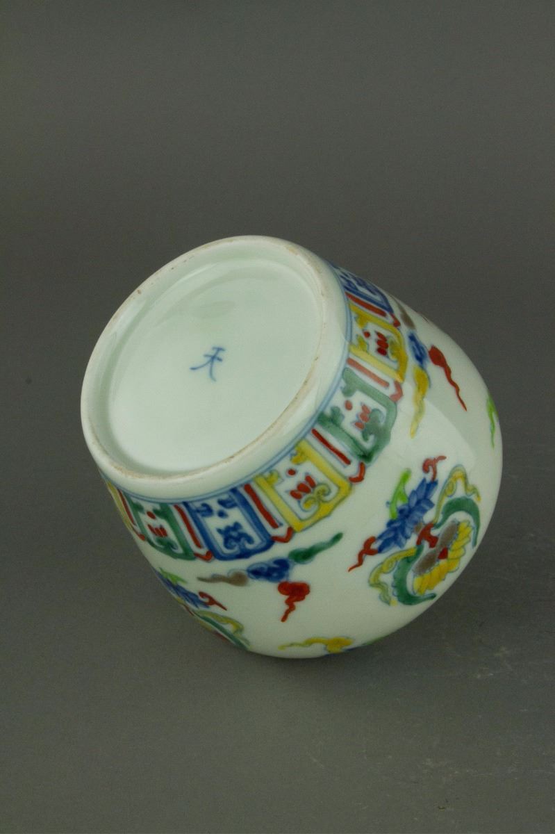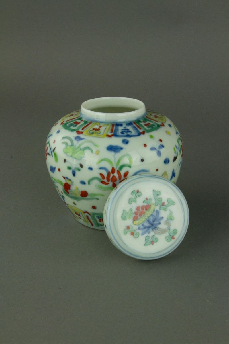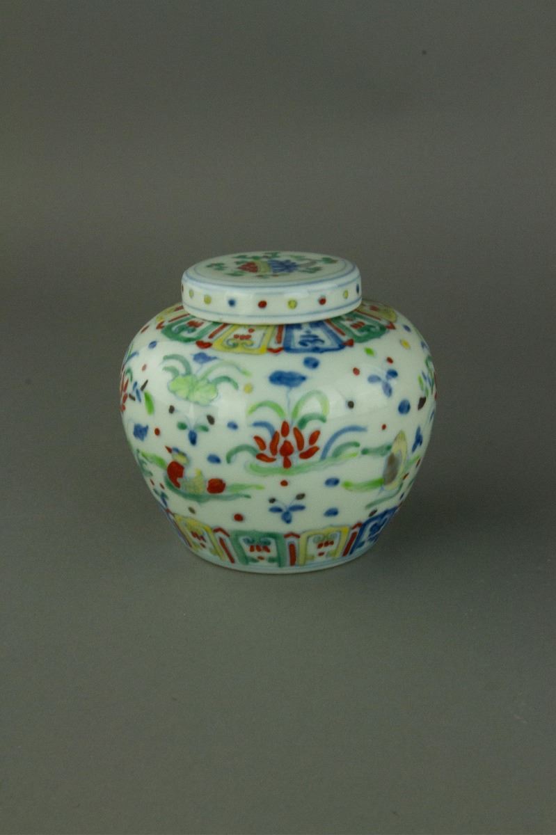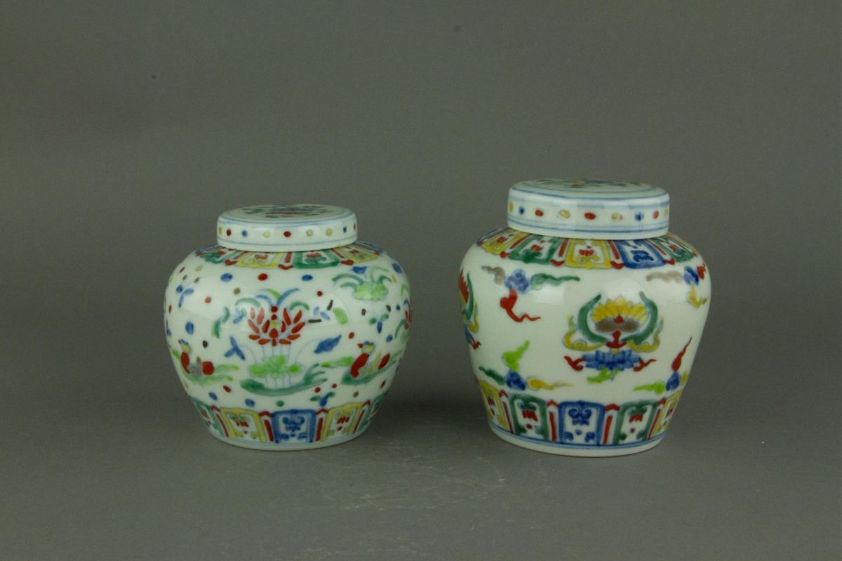 Pair of Chinese Doucai porcelain jars; of compressed globular body with flatten covers; painted with mandarin ducks on lotus pond and lotus emblems amidst clouds; one-character Tian mark on base; H: 10 cm, D: 10 cm, 153 grams each