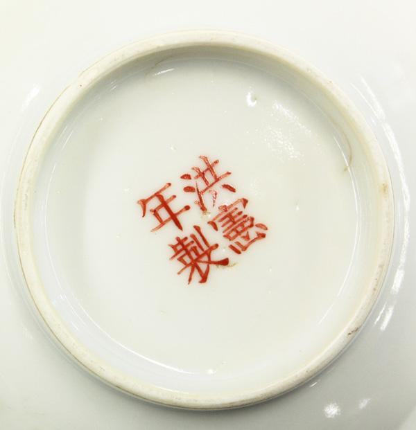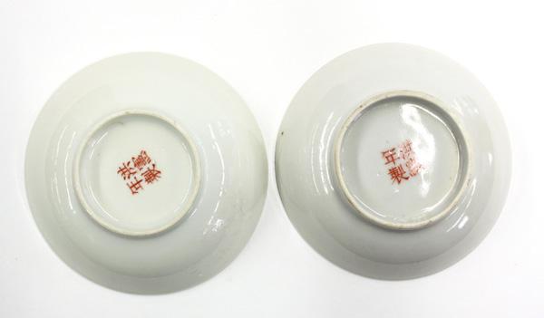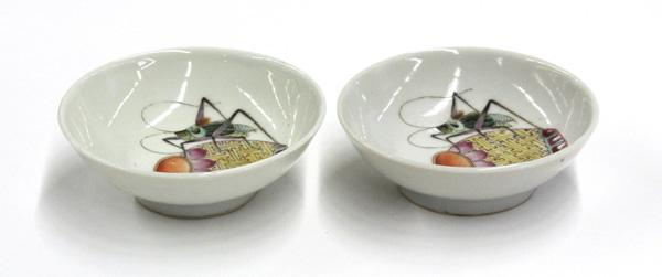 Pair of Chinese polychrome enameled small porcelain dishes, each interior well enameled with a grasshopper climbing up the side of a yellow wine jar decorated with a wanzi pattern, the recessed base with a Hongxian mark, 3.125''w