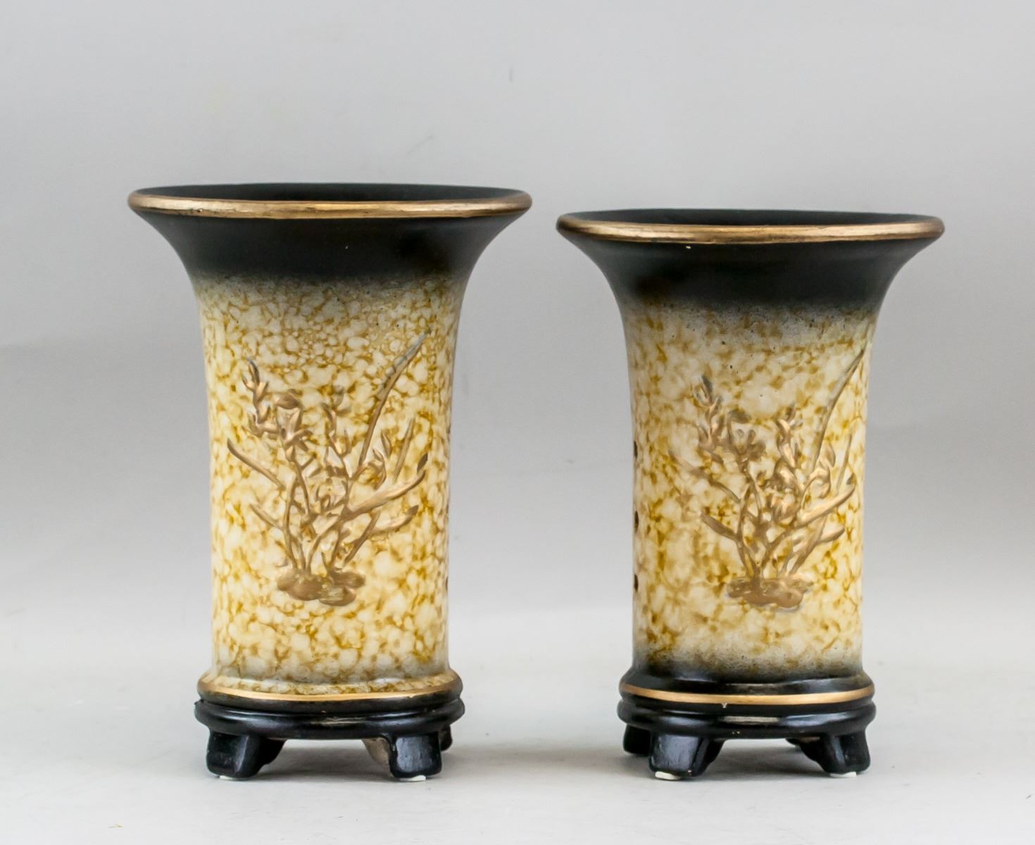 Pair of Chinese gilt porcelain vase. Of cylinder form body with splayed mouth. Carved with grass. MADE IN CHINA mark on base. D: 14 cm, H: 18 cm, 456 grams