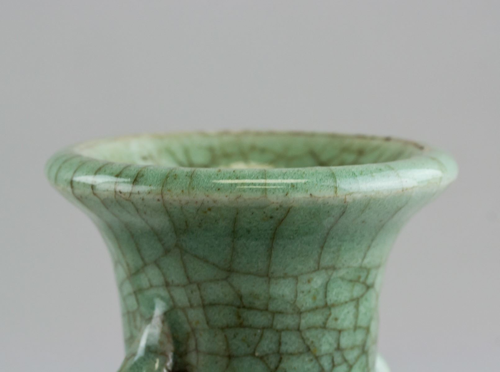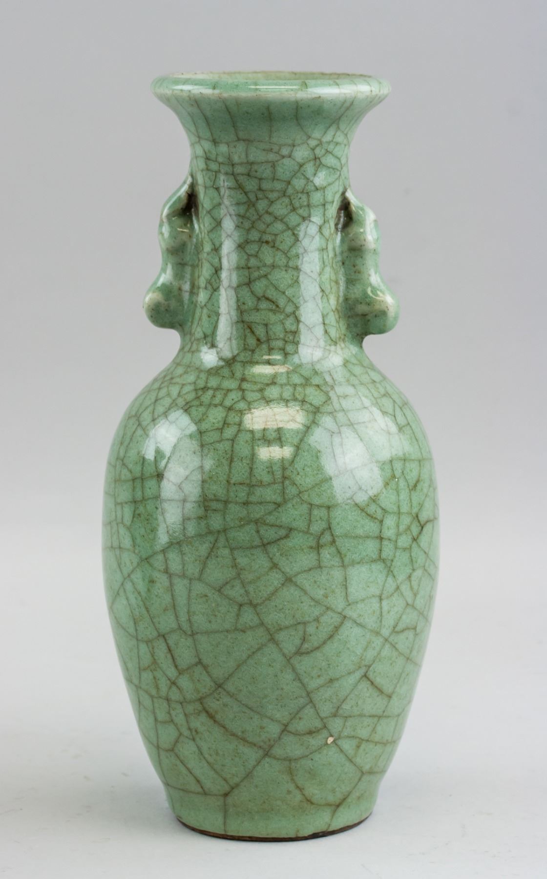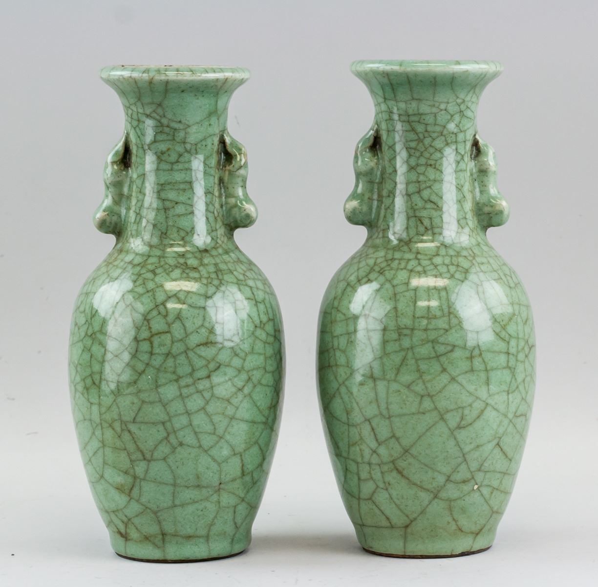 Pair of Chinese Guanyao style porcelain vase. Of ovoid form body, flanked with beast form ears. Covered by green crackle glaze. 24 x 13 cm, 938 grams