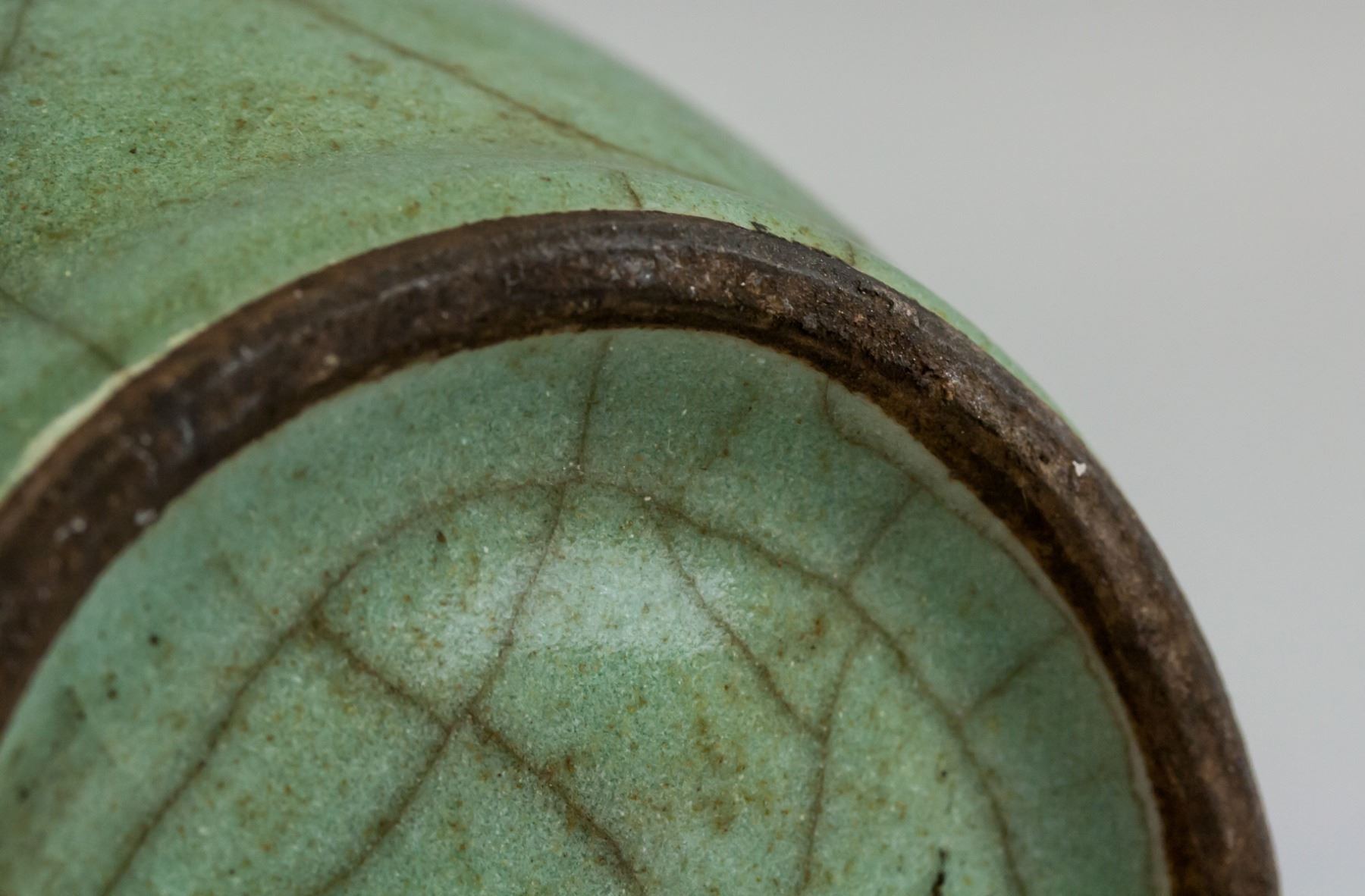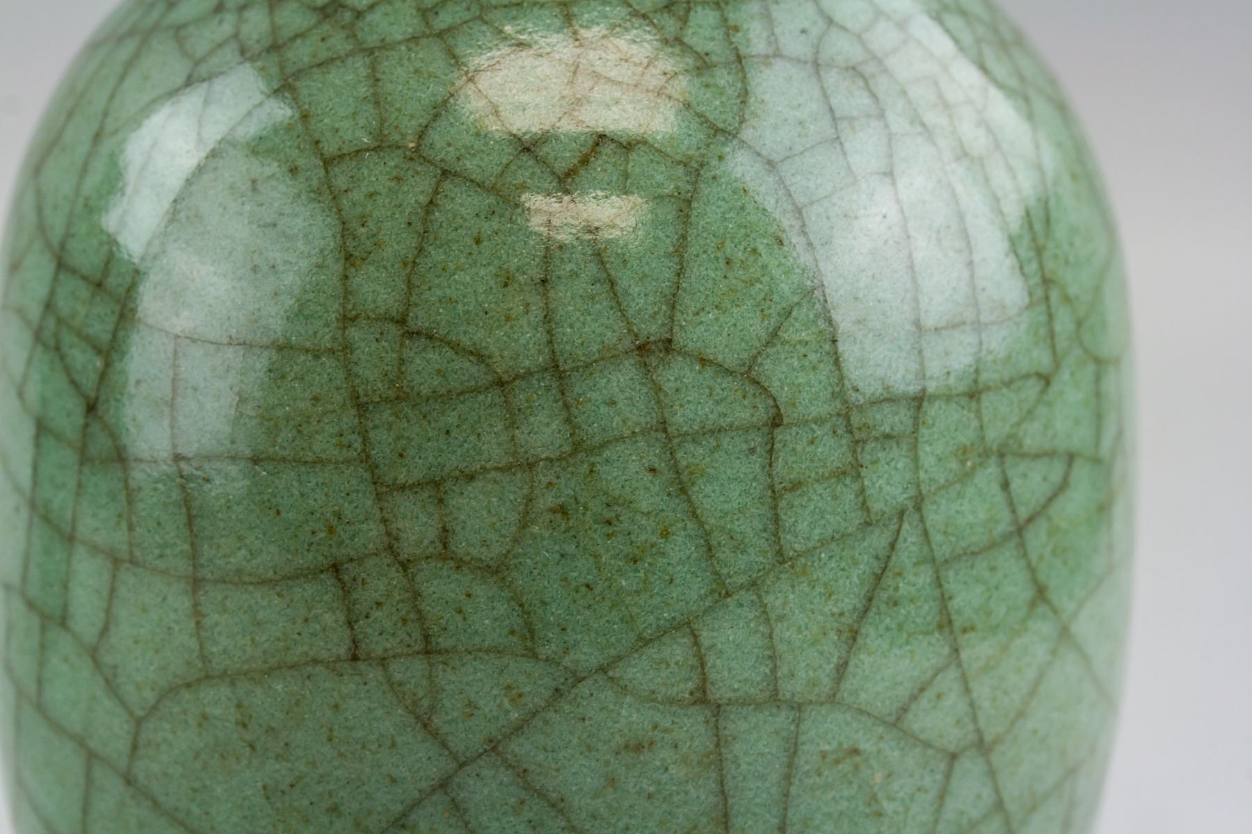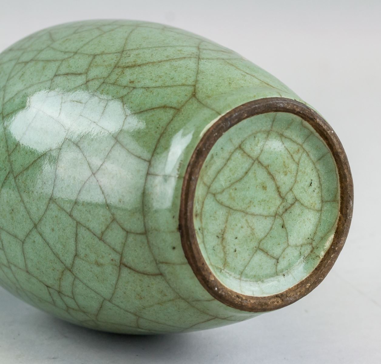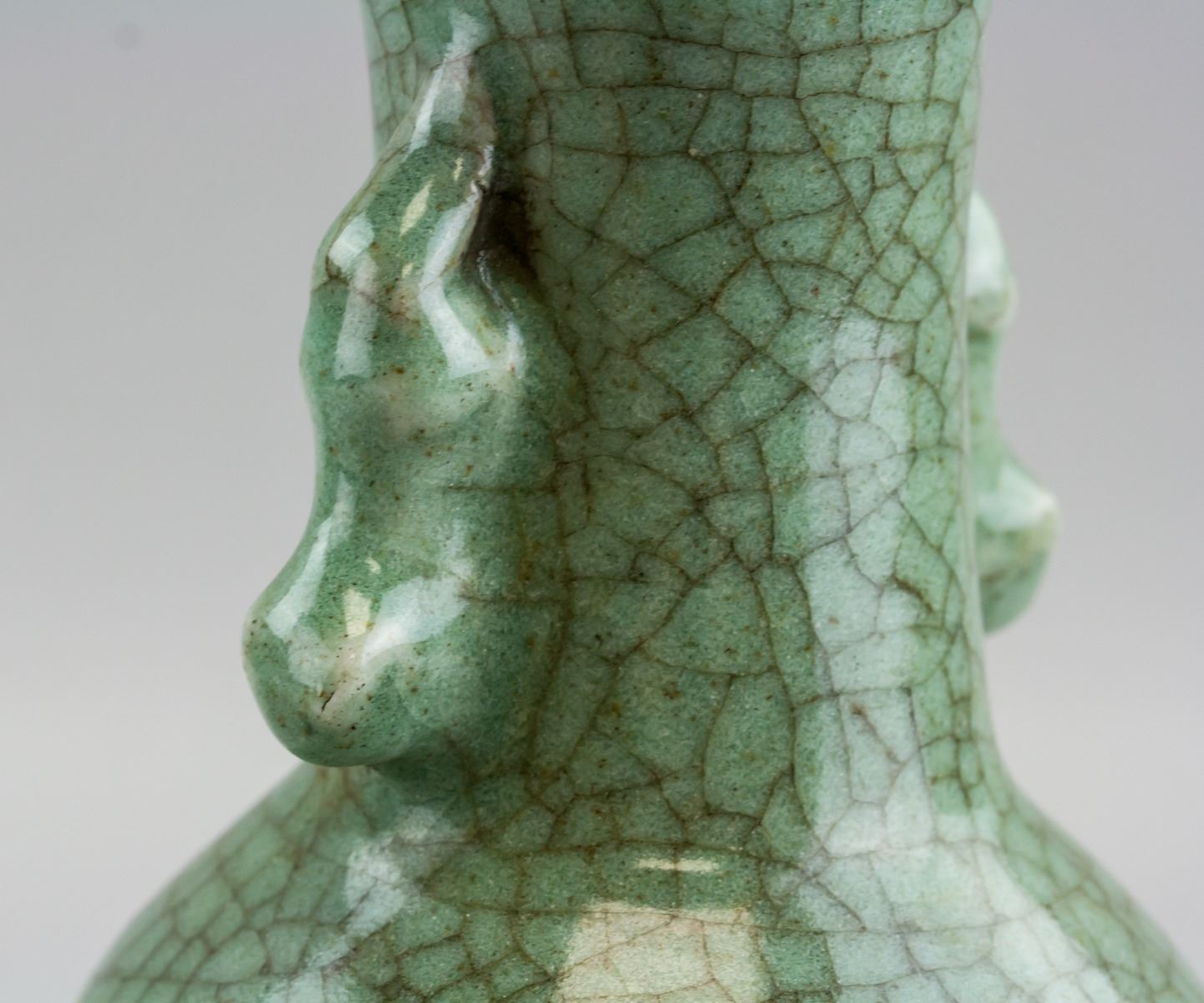Pair of Chinese Guanyao style porcelain vase. Of ovoid form body, flanked with beast form ears. Covered by green crackle glaze. 24 x 13 cm, 938 grams