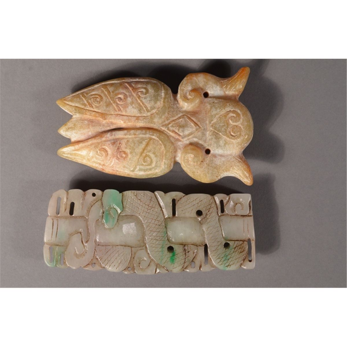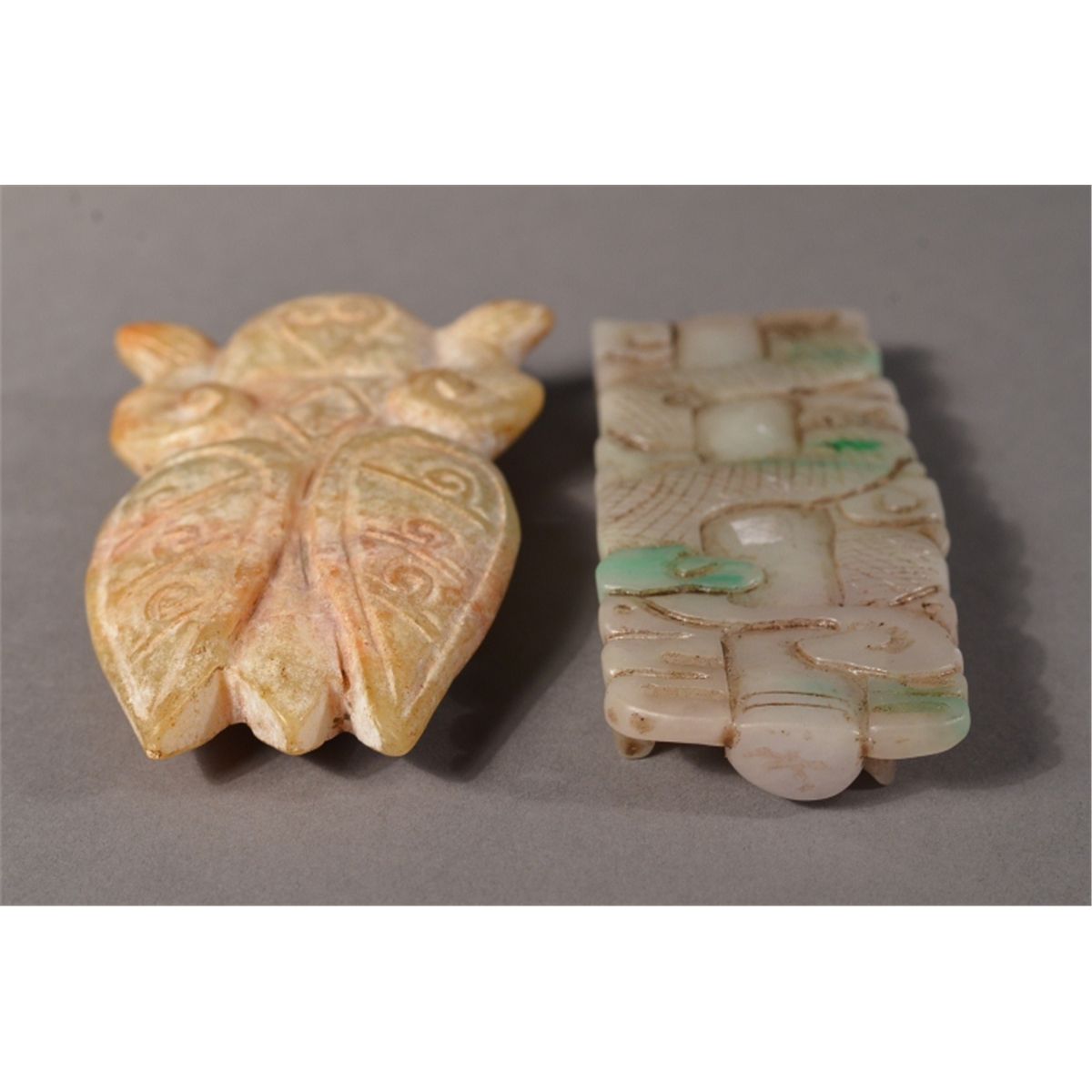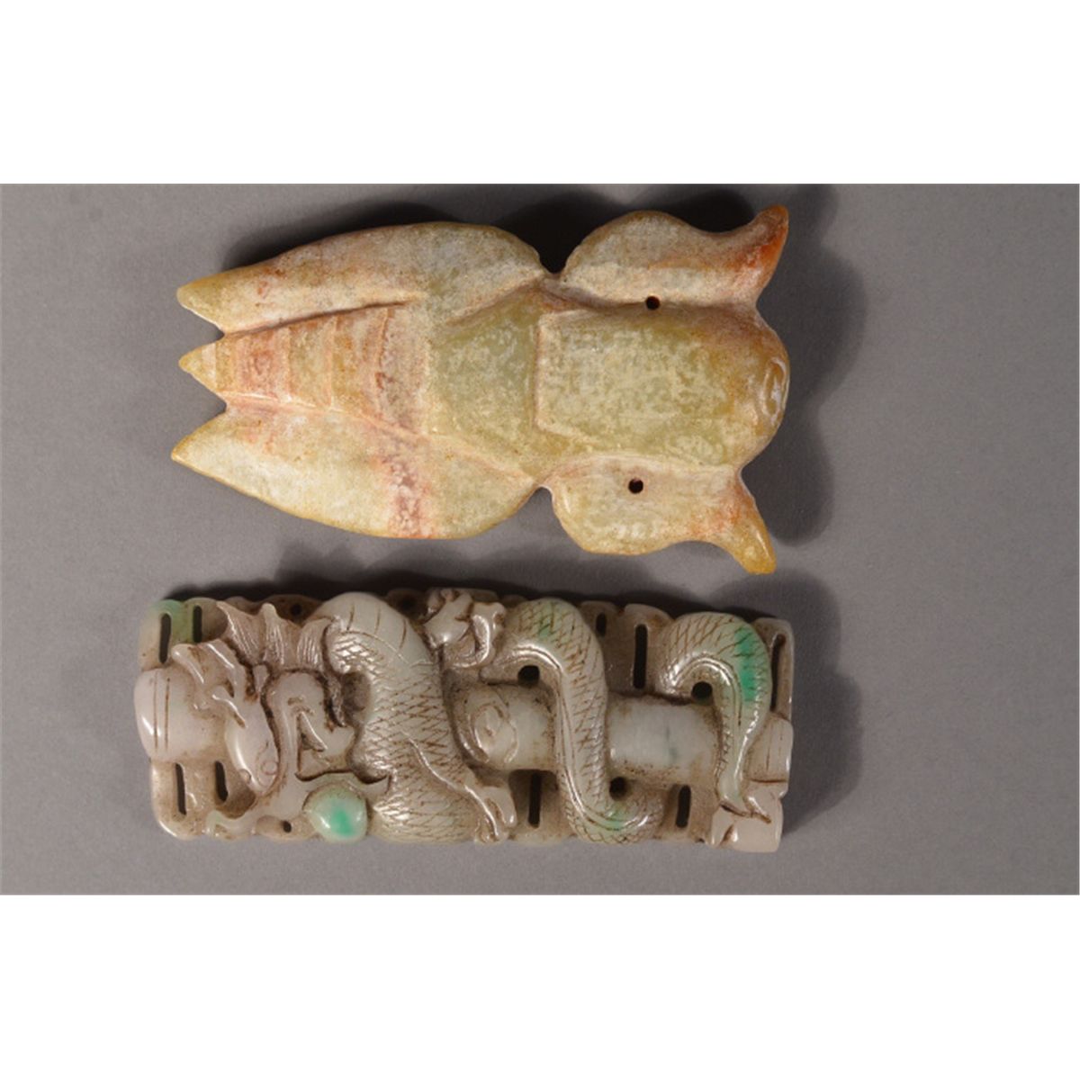 Pair of Chinese Qing Period jade carvings: featuring writhing dragon chasing pearl; cicada carving with incised detailing; 10 cm X 4 cm X 1.5 cm (approx.)