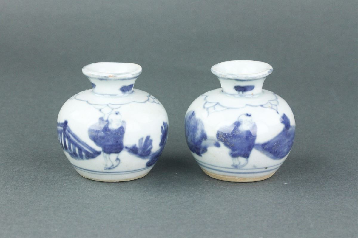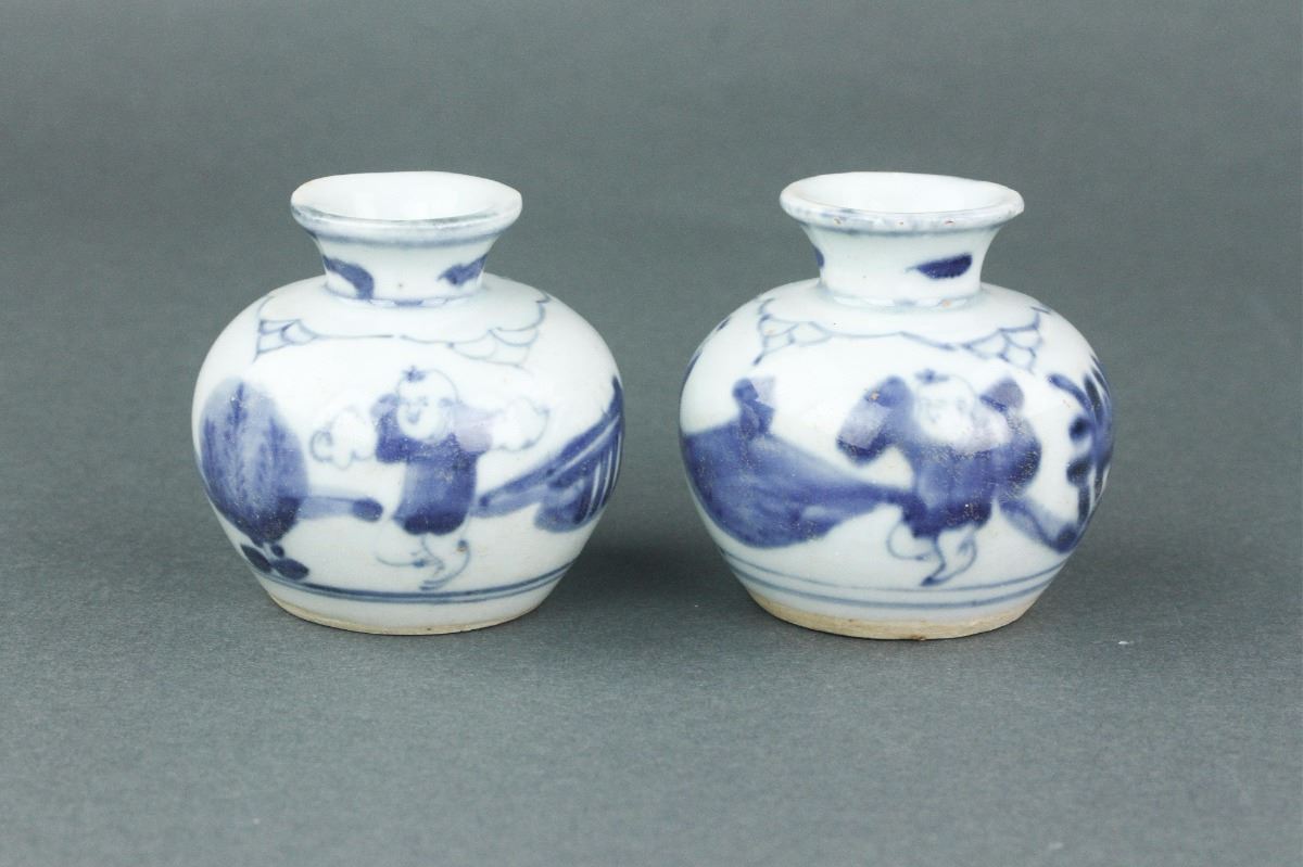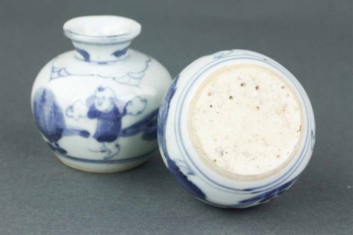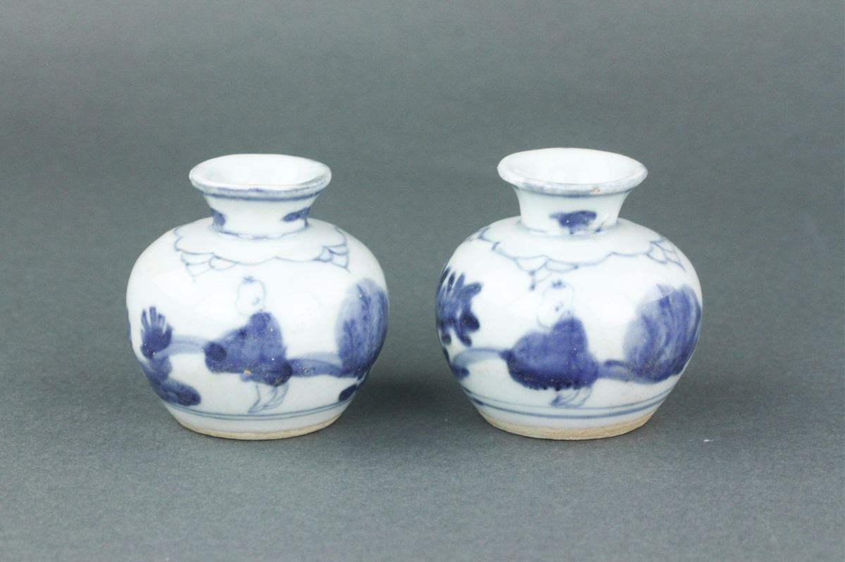 Pair of Chinese blue and white porcelain small jars; of globular body with splayed mouth; featuring children having leisure time at courtyard; unglazed base; H: 5 cm, D: 6 cm, 185 grams total
