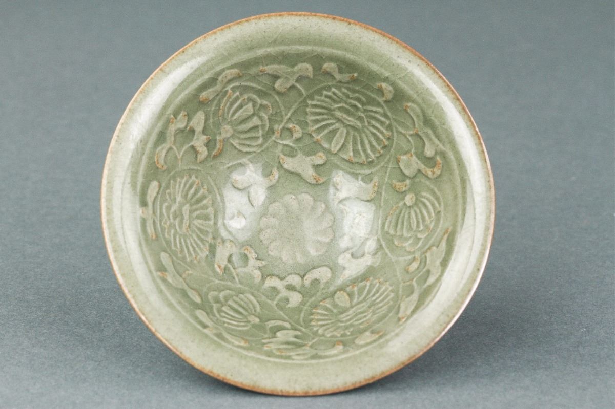 Pair of Chinese porcelain bowls; Song style; of steep rounded sides rising to everted rim; the interior carved with lotus scrollwork; H: 4 cm, D: 10 cm, 222 grams both