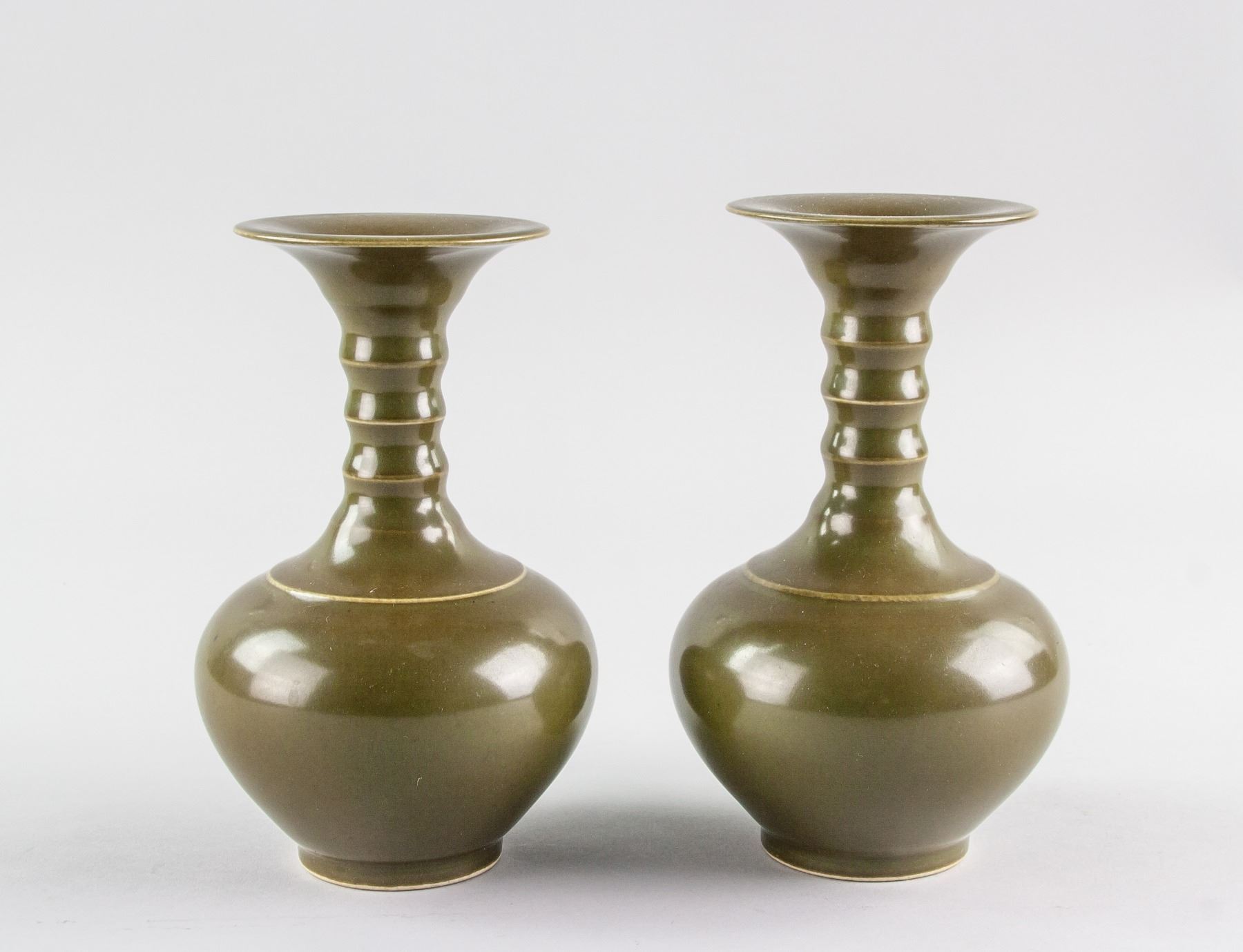 Pair of Chinese tea dust glaze porcelain vase, of globular body, with narrowed neck and splayed mouth rim, covered by tea dust glaze, six-character Ming Wanli (1573-1620) mark on base, H: 15 cm, W: 9 cm, 386 grams, each