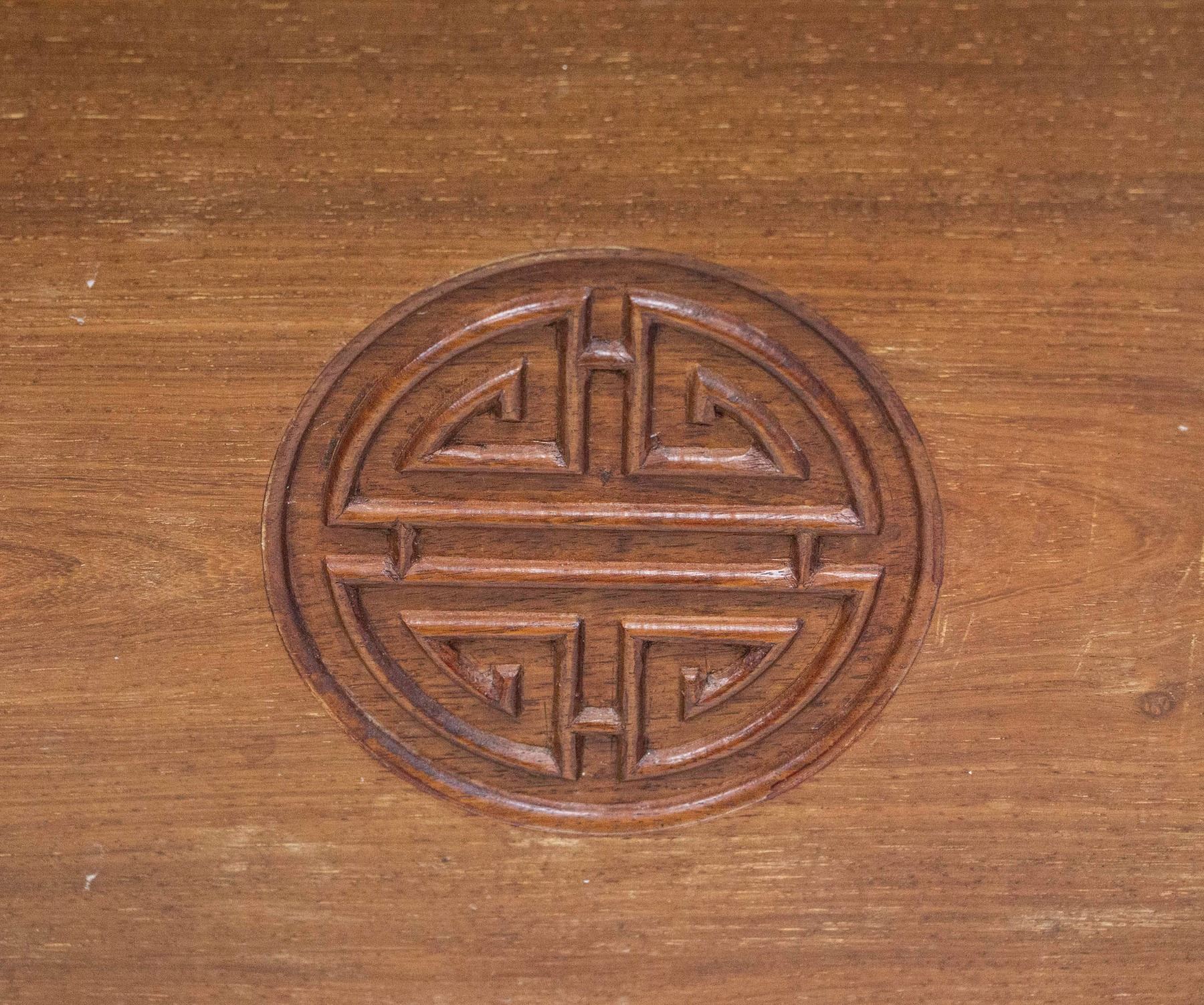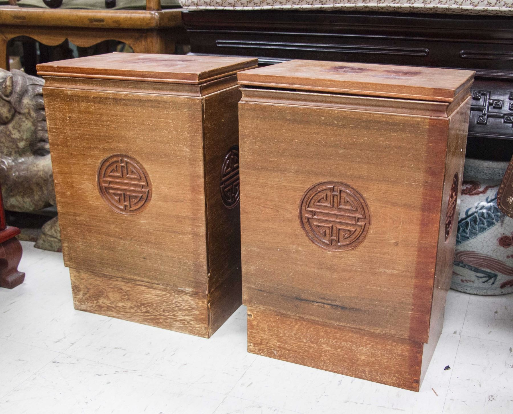 Pair of Chinese wood talbe; of rectangle cube form; carved with Shou (longevity) symbol decoration; 46 cm x 30 cm x 23 cm