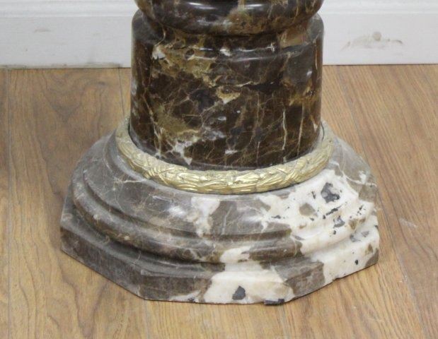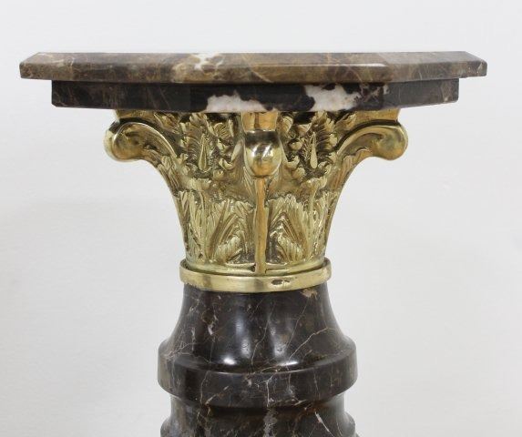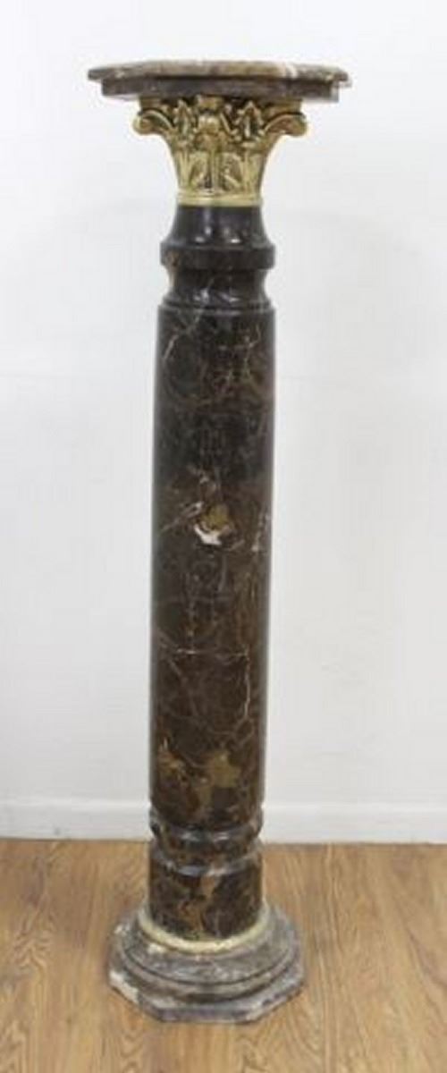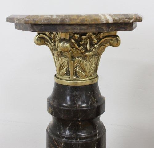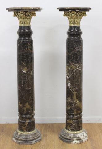 Burnt umber colored marble, octagonal tops, with bronze collars. With bronze ormolu. Approx. 55" H x 14" W.