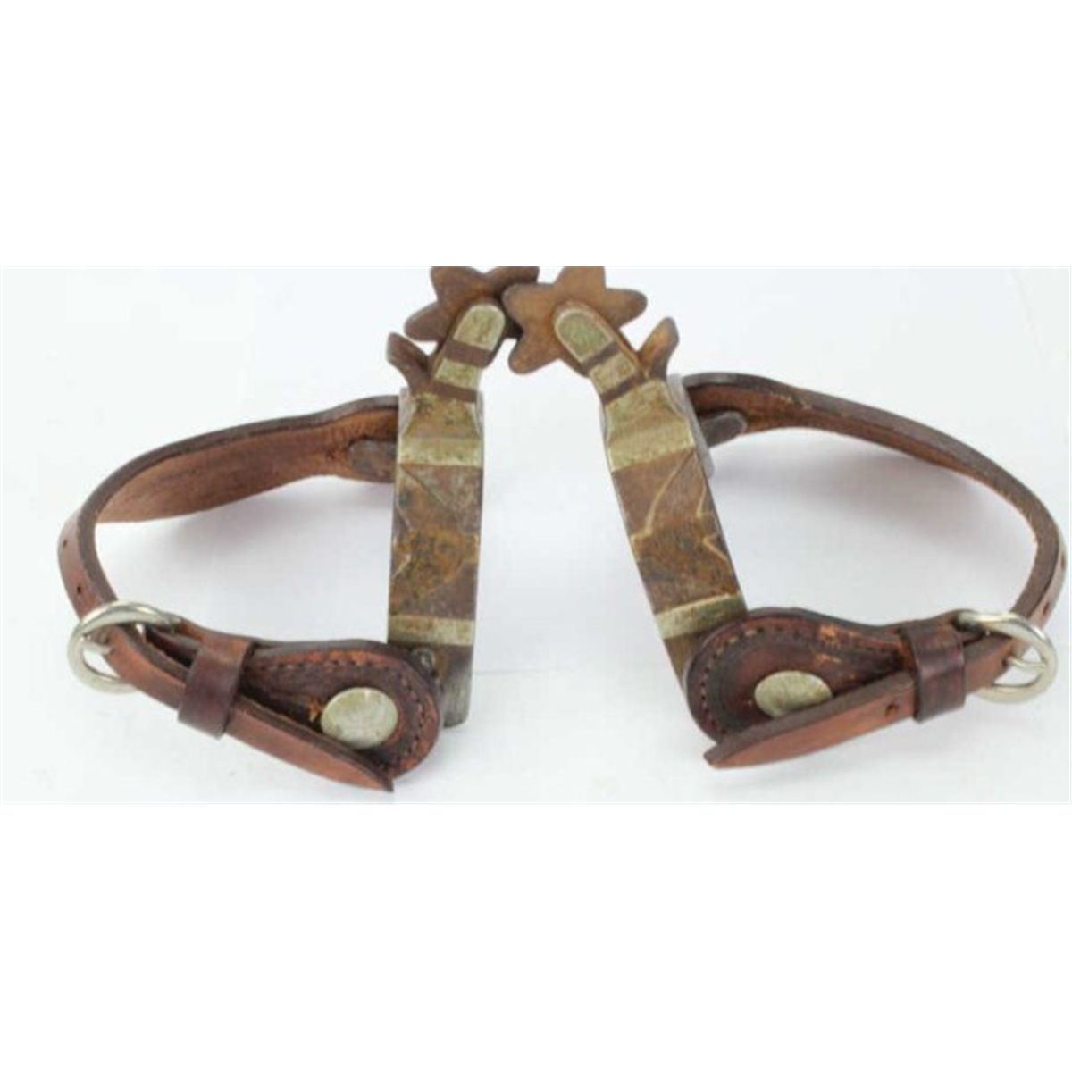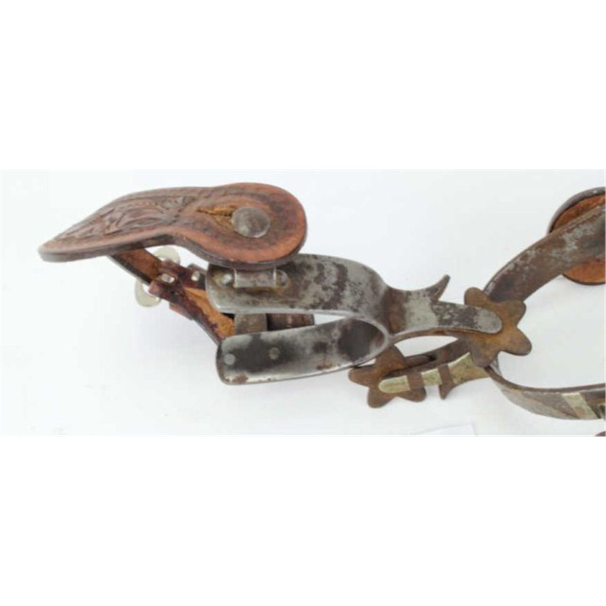 Pair Crockett thunderbird pattern spurs with leathers which are unmarked, later straps. Spurs show heavy dark patina with exception of right spur, the inner heal band shows some cleaning. All original straight from a ND ranch.