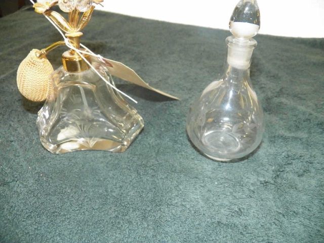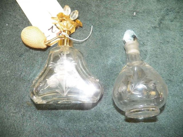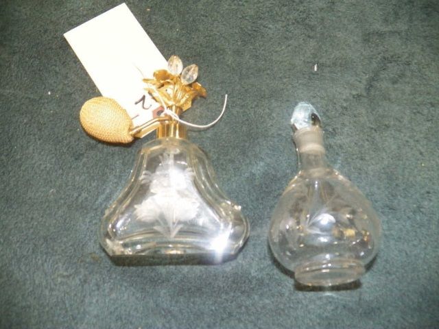 Lg. etched base with gold flowers and crystal accent 5"tall by 4 1/2" wide. Crystal etched perfume bottle 6" by 3"