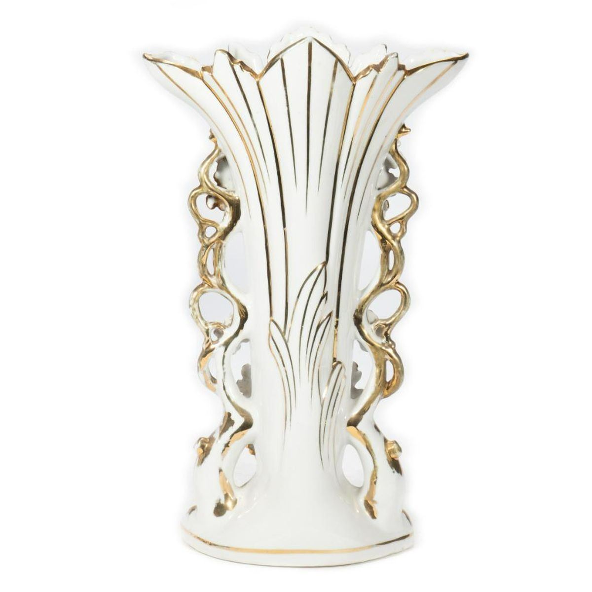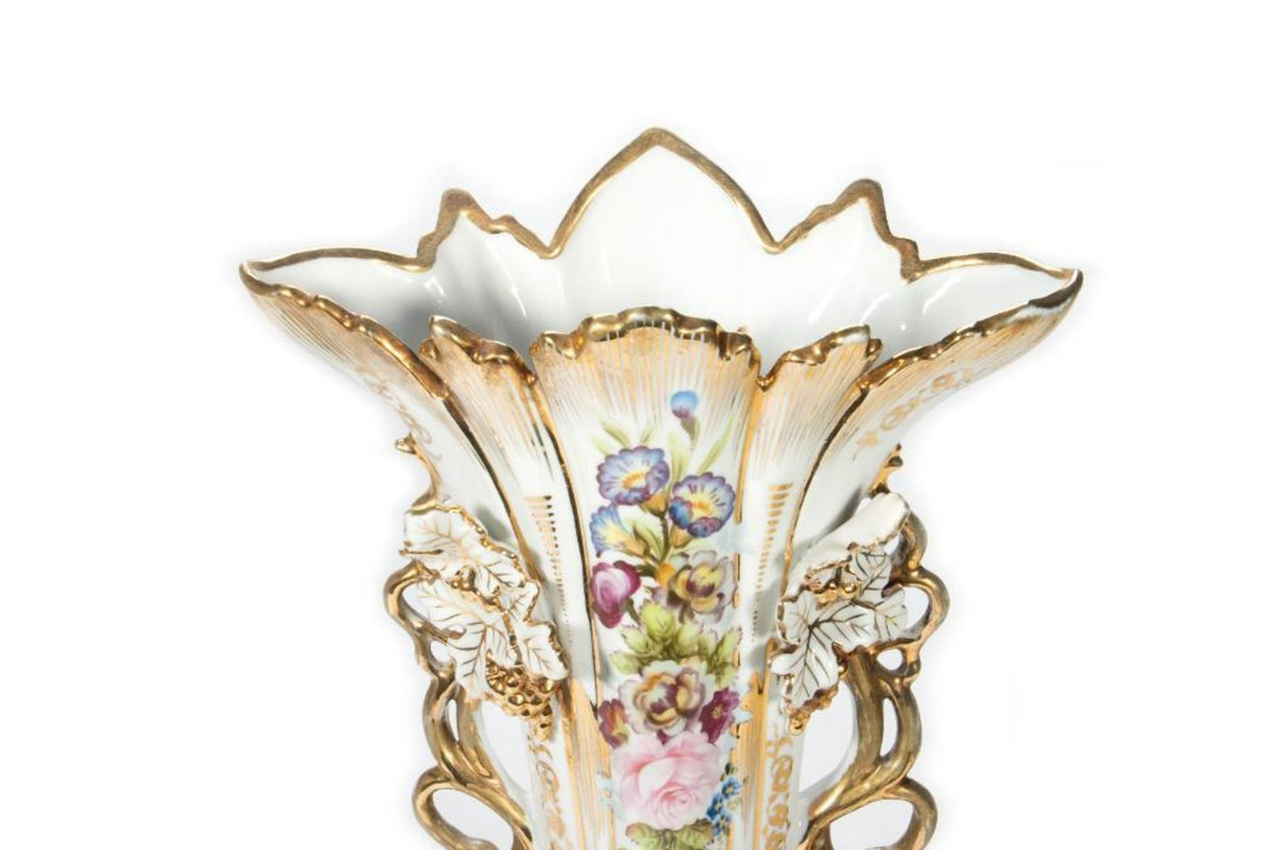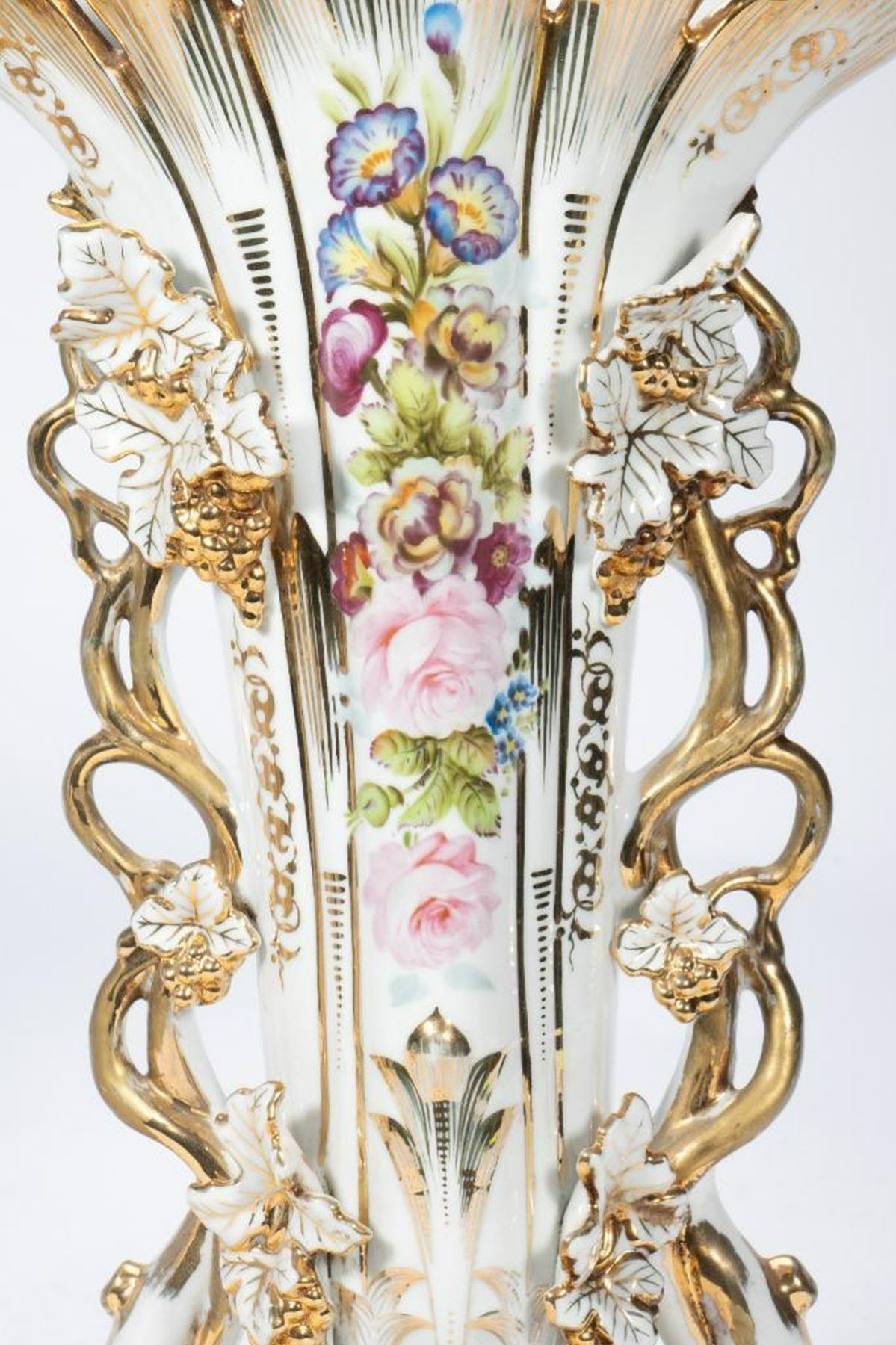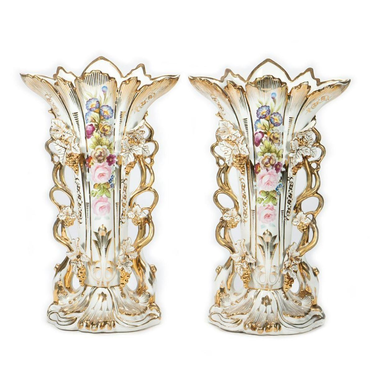 Each with scalloped edge decorated with gilt vines and polychrome floral spray. 17in. h. Condition: Very good, no chips or cracks