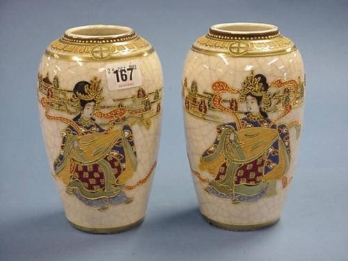 Pair Earthenware Satsuma Style Vases 18.5cm. Height Depicting Lady Playing Stringed Instrument - Gilt Decoration £40-60