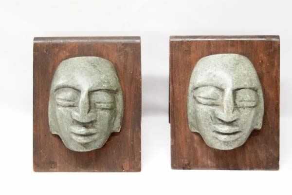 From the Proctor Estate in Silver City NM, we have a Pair of Mayan Jadeite Mask Bookends, masks are mounted on wood, measure 6.5''W x 11.25''H x 4''Deep