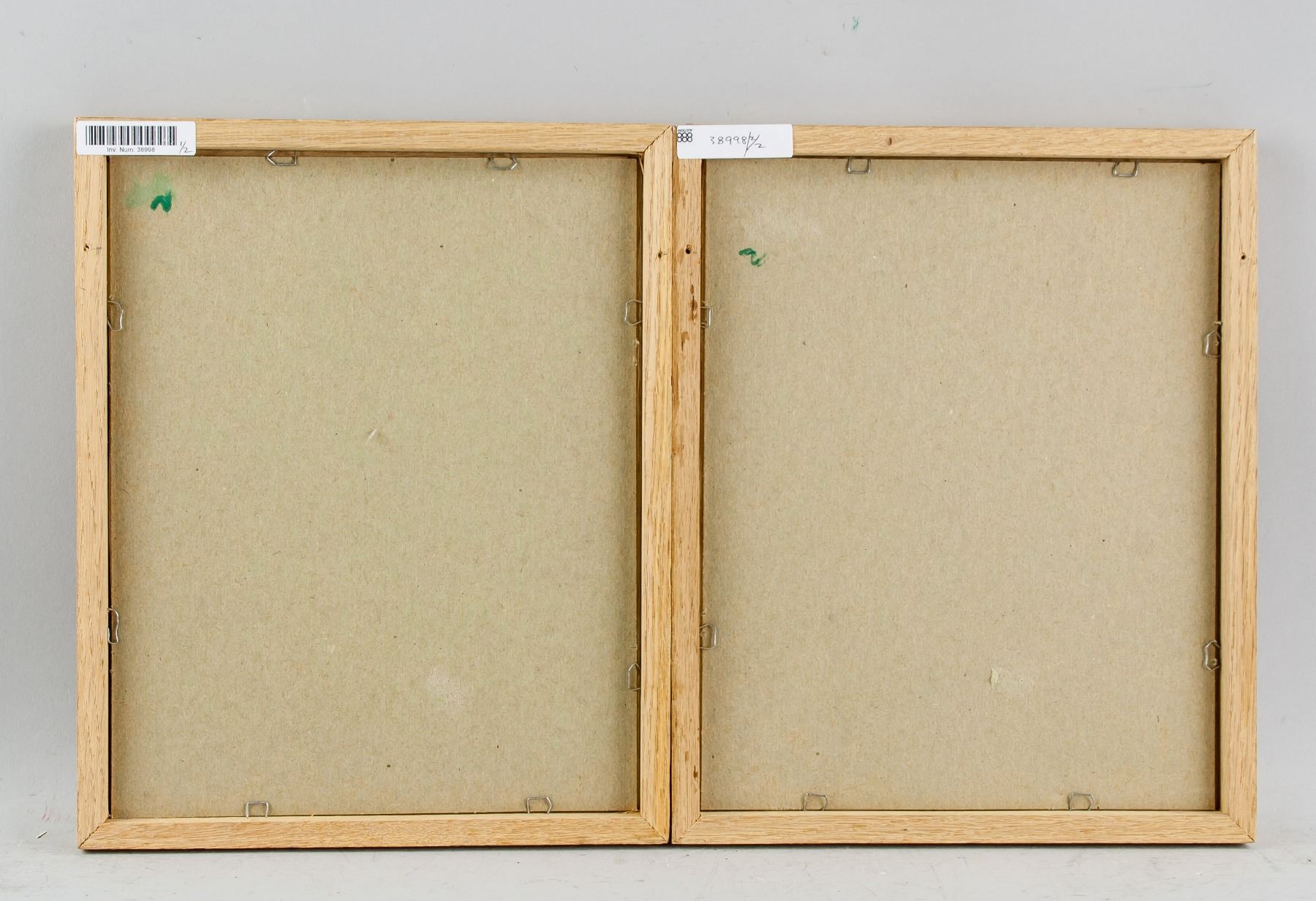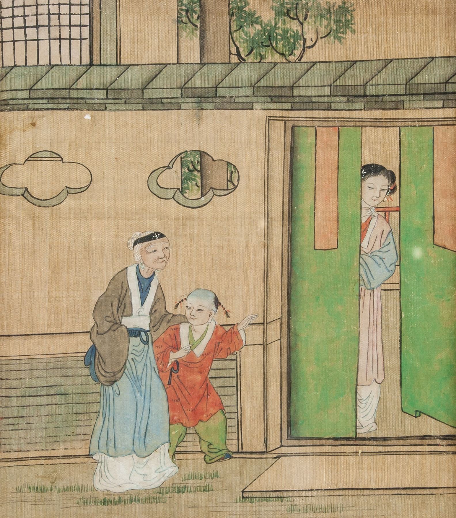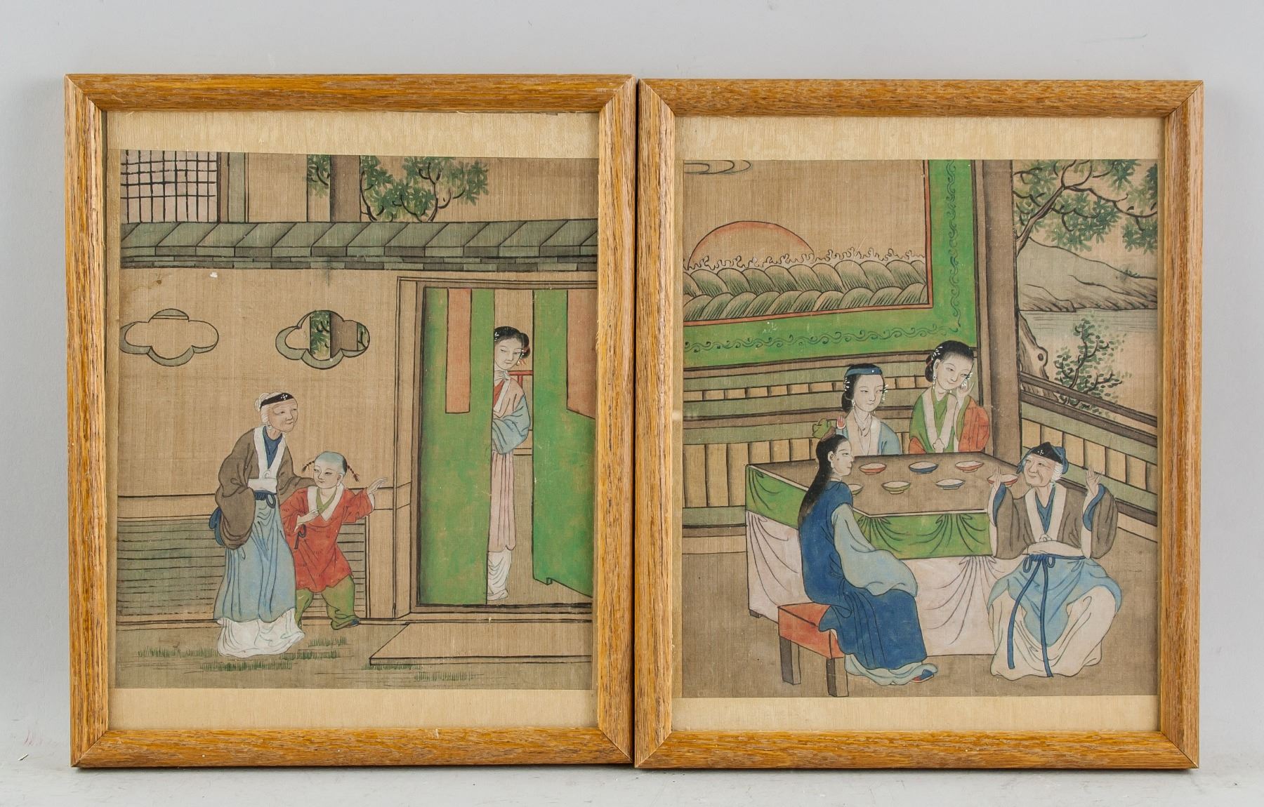 Watercolor on paper, framed, featuring dutiful children scene, 21.5 x 18 cm each