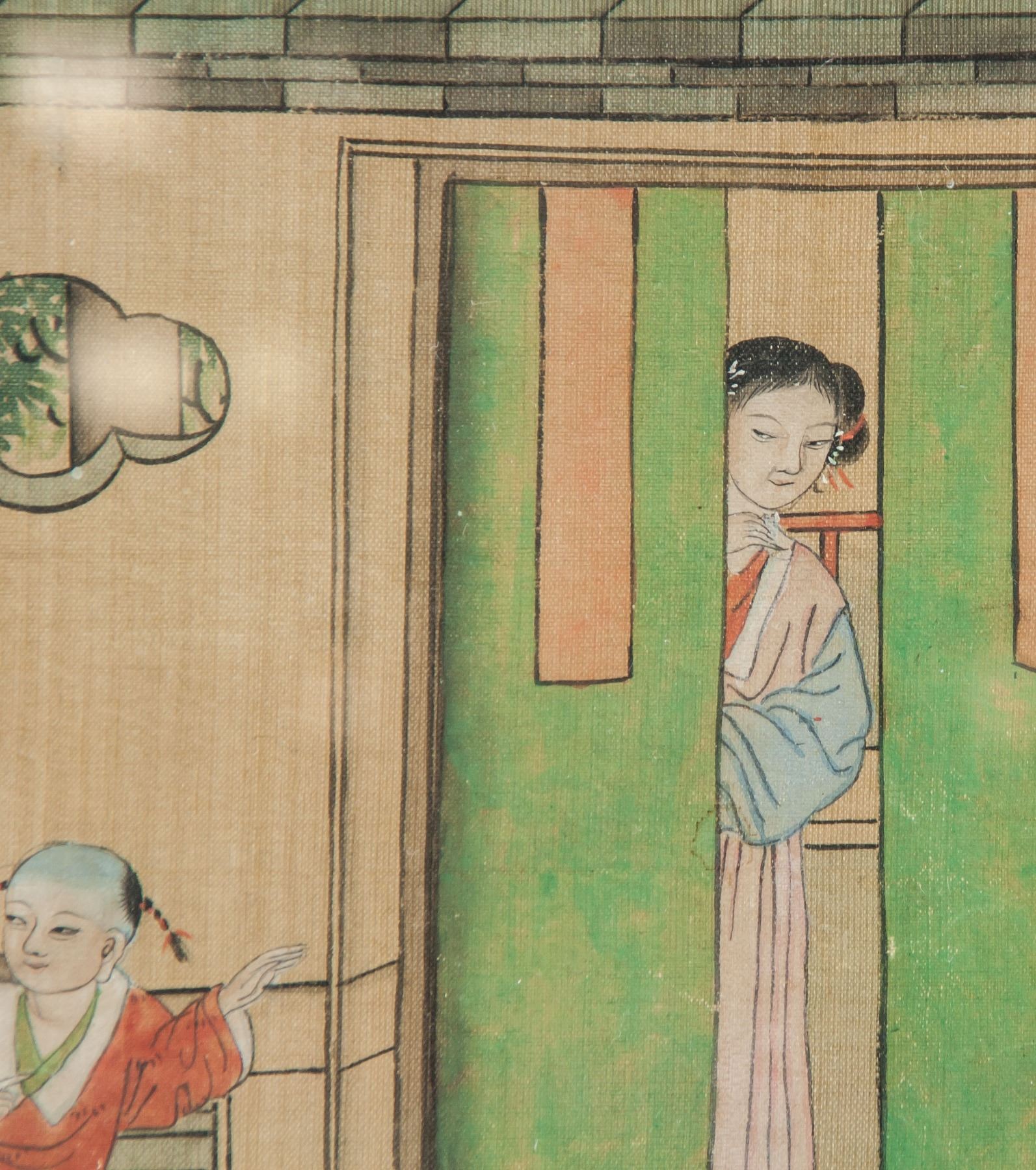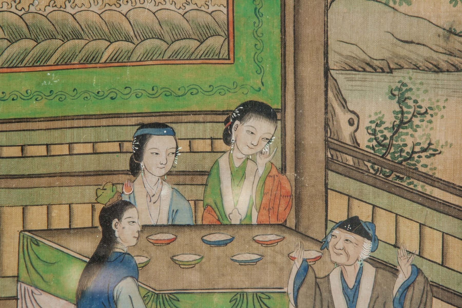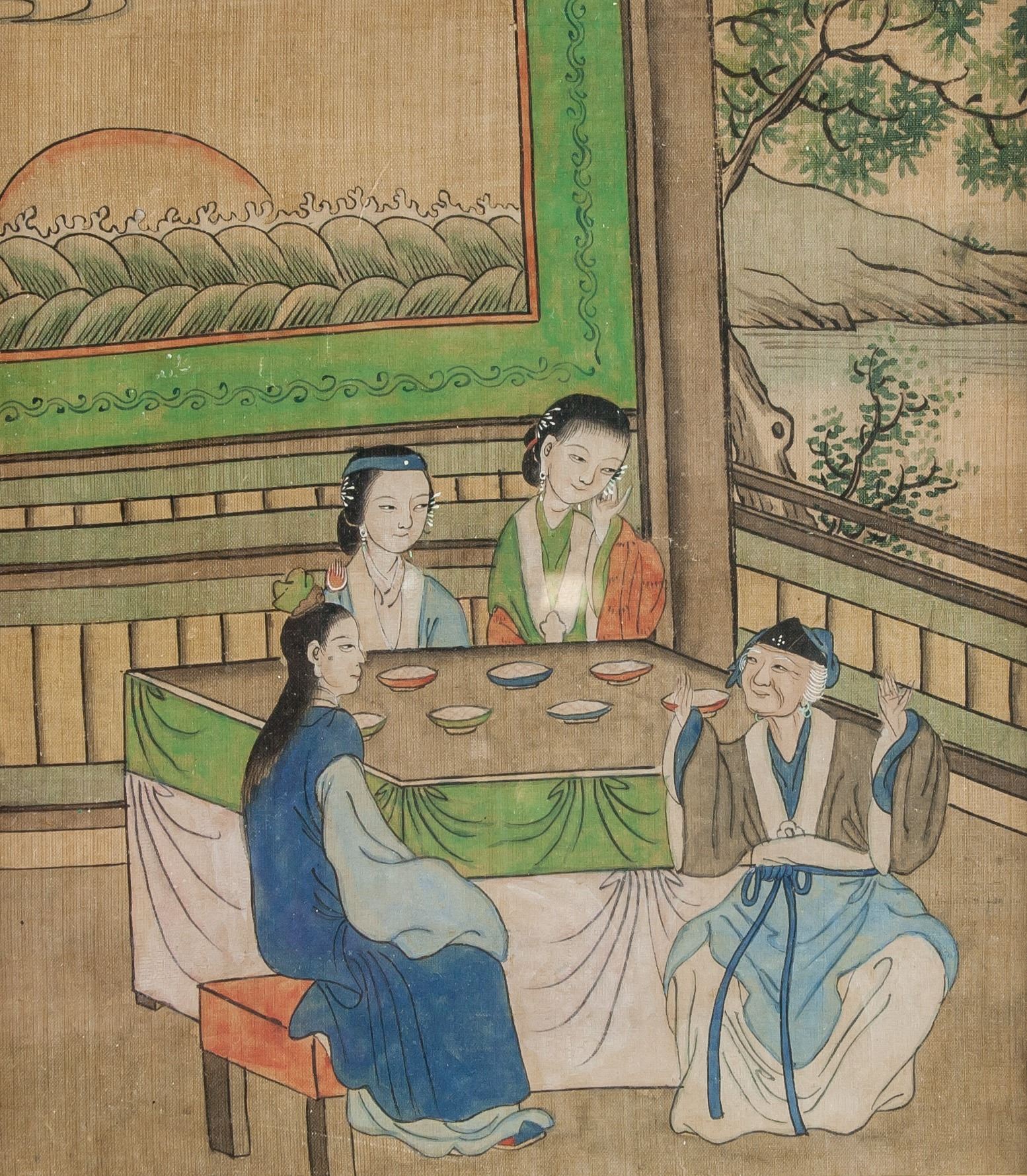 Watercolor on paper, framed, featuring dutiful children scene, 21.5 x 18 cm each