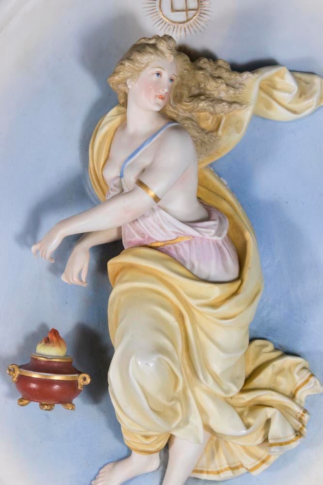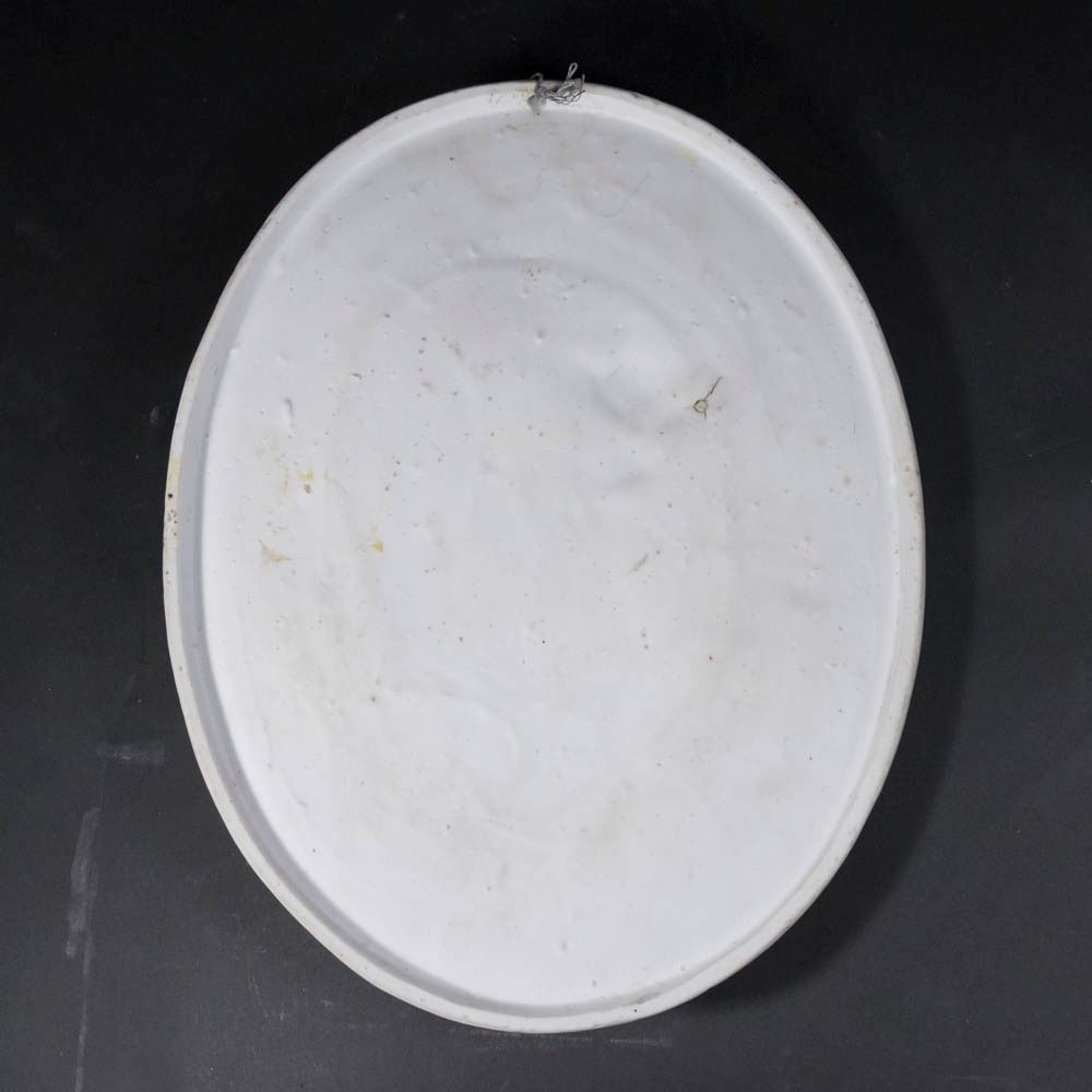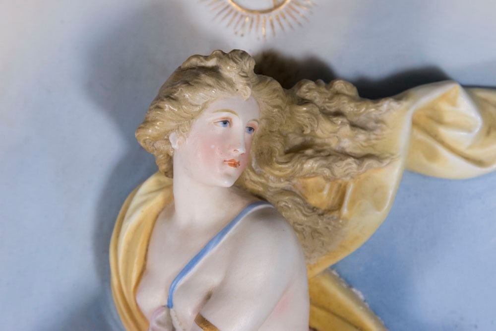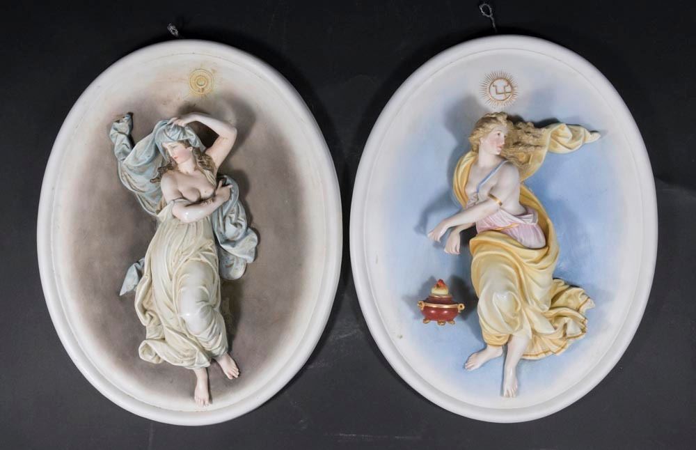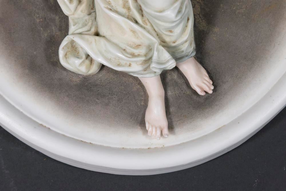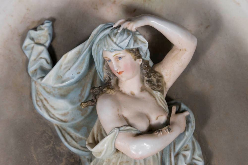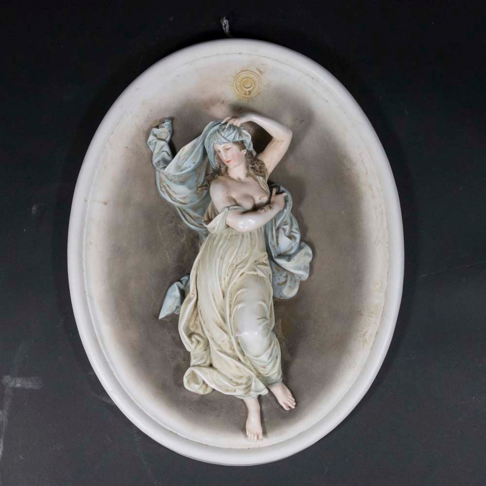 Depicting women. Approx. 14" H x 11" W. Lady in blue clothes with broken and missing part over arm.
