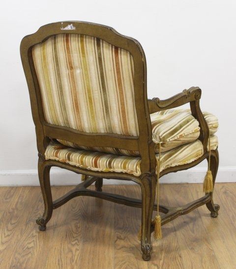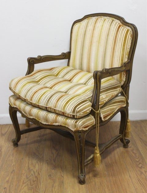 Gold and yellow striped upholstery. Approx. 34" H x 24" W x 20" D. Finish flaking on some parts.