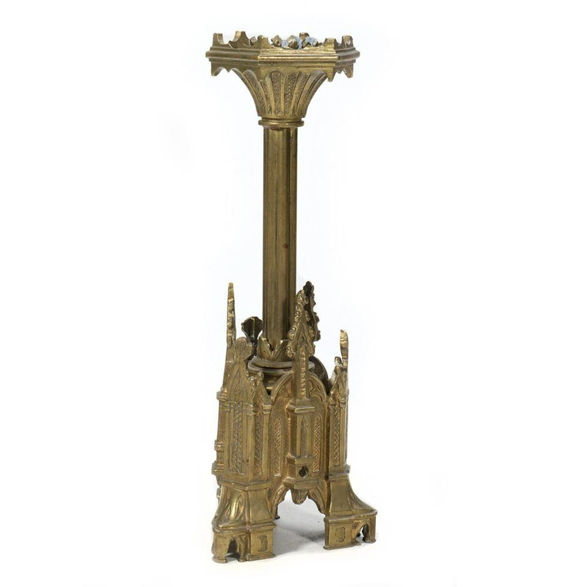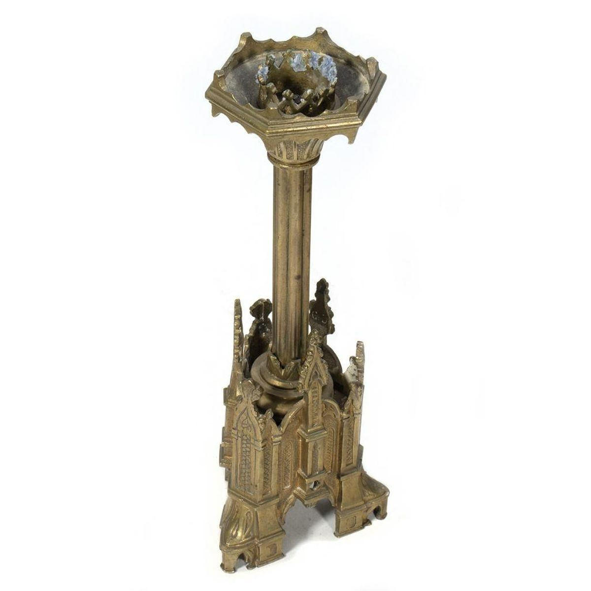The gilt-bronze Gothic candlesticks 10in. Together with a model of a Gothic church, 8 1/2in. h. Condition: Very good.