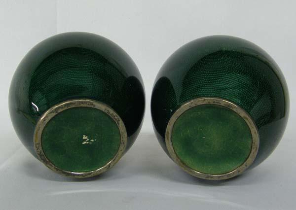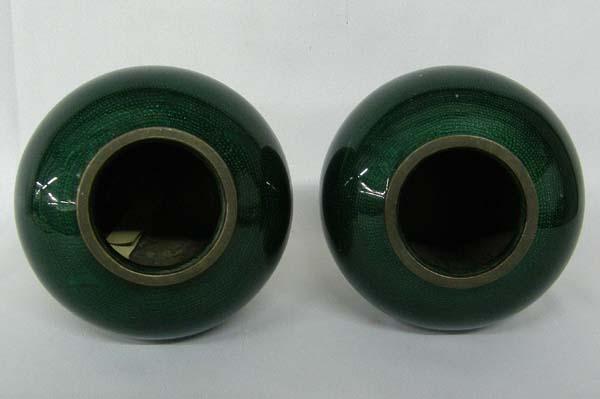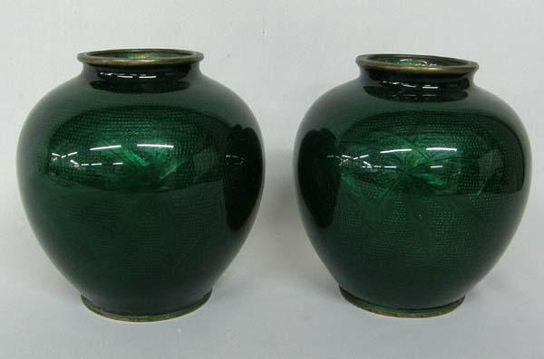 Pair Green Enamel on Metal Vases, measures approx. 5.5'' x 5.5''. SHI $25.